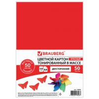 Цветной картон, А4, двусторонний, тонированный, 220 г/м2, 50 листов, красный интенсивный, BRAUBERG, 128982