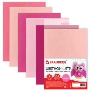 Цветной фетр для творчества А4 210*297мм BRAUBERG 5л., 5цв., оттенки розового 2мм 660644