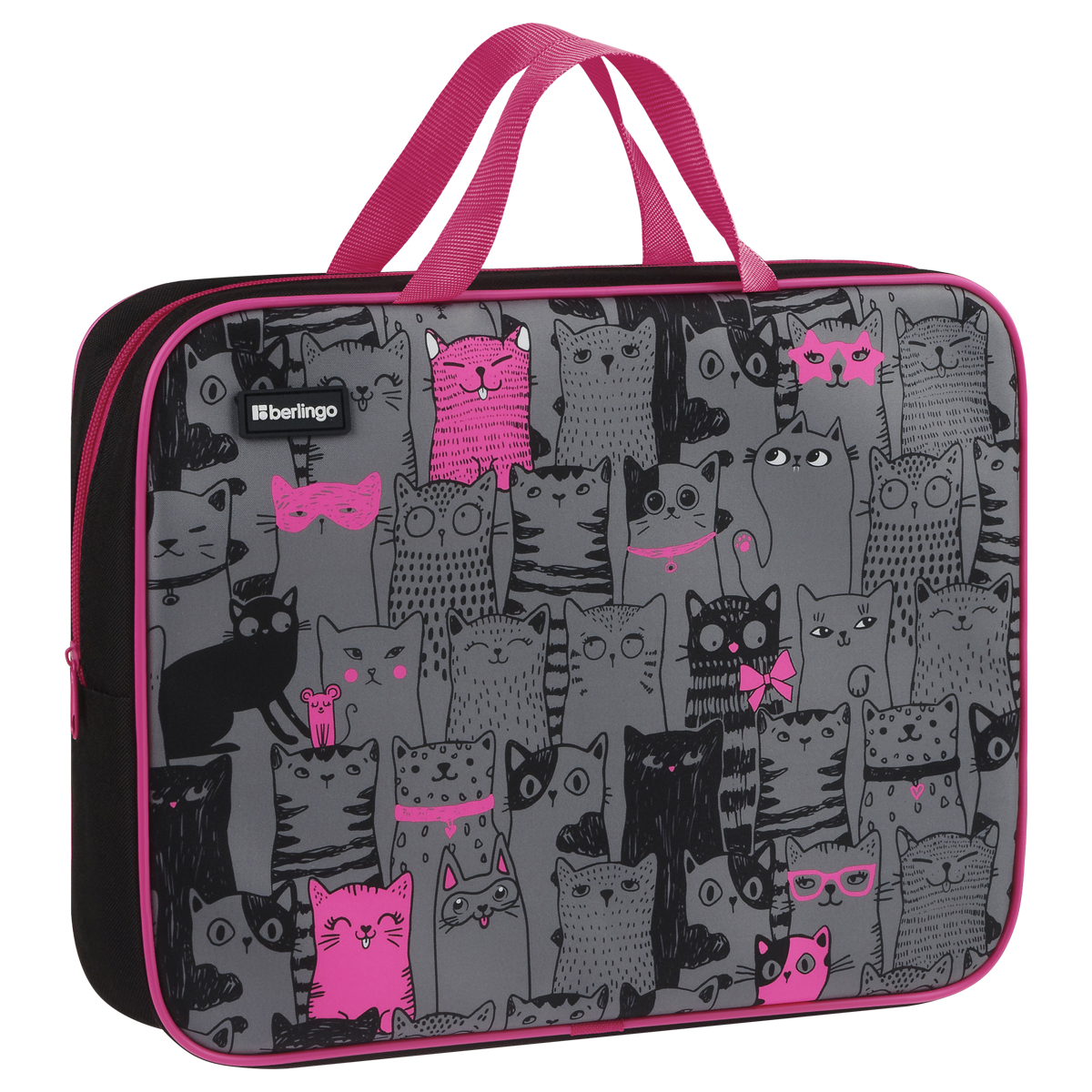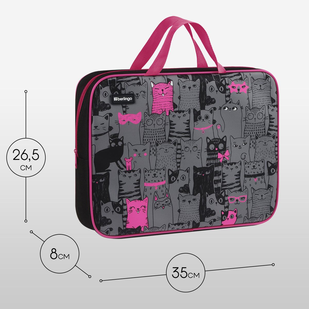 Папка с ручками на молнии для тетрадей Berlingo Happy cats формата А4 станет стильным помощником в учёбе, предназначена для хранения документов. Изделие размера 350*265*80 мм имеет одно отделение и карман внутри. Застежка-молния сверху надежно защищает содержимое от грязи и влаги. Наличие ручек обеспечивает удобную транспортировку. Папка предназначена для тетрадей, альбомов и прочих канцелярских принадлежностей, имеет увеличенную ширину торцевой стороны, что позволяет вместить все необходимое. Оформление папки непременно понравится девочке. • Формат: А4; • Ширина: 80 мм; • Материал: пластик, ткань; • Количество отделений: 1; • Вид ручек: тесьма; • Тип застёжки: молния.