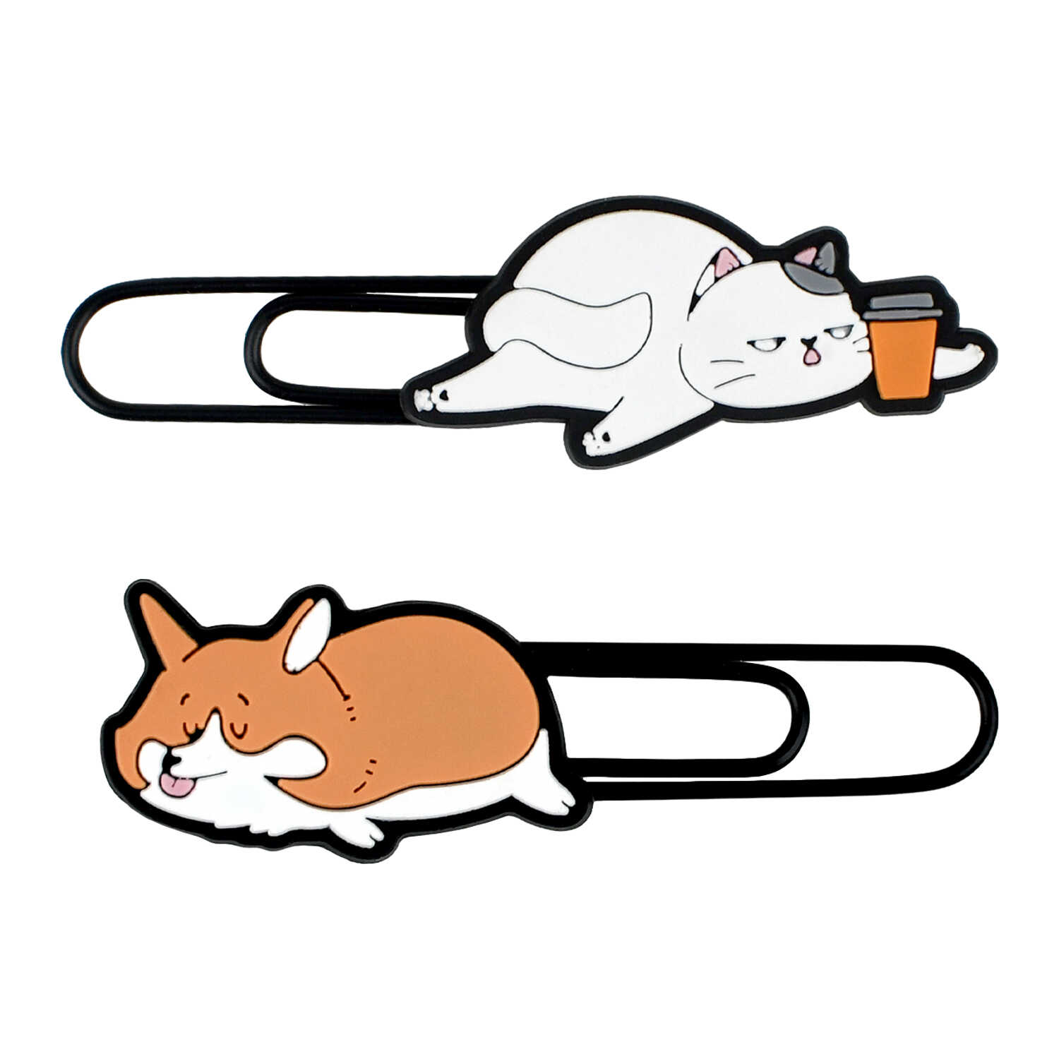 Скрепки-закладки для книг, арт. 71034 / 48 КОТ И КОРГИ (2 шт. в наборе, размер: 20х65; 20х72 мм, материал: металл, ПВХ; цвет: чёрный, белый, оранжевый; особенности: наконечник фигурный из ПВХ, ПВХ-оплётка; индивидуальная упаковка: подложка с европодвесом из мелованного картона + ПЭТ-пакет