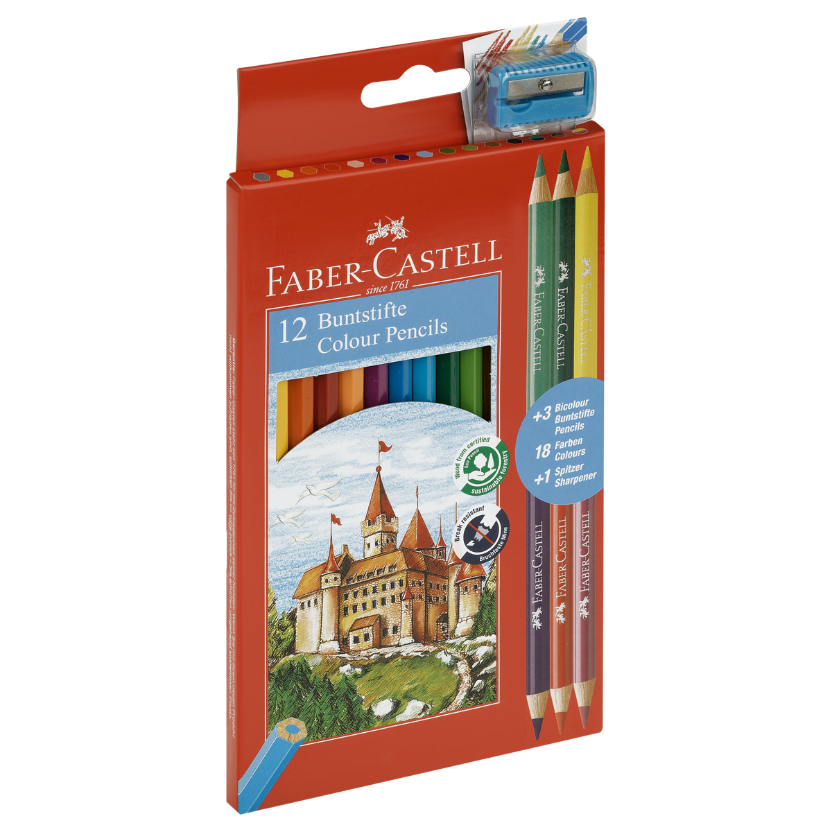 Набор цветных карандашей серии «Замок» от легендарного немецкого производителя Faber-Castell. Набор состоит из 12 карандашей шестигранной формы, 3 двусторонних карандашей круглой формы и точилки. 18 ярких цветов в наборе! Грифель карандашей состоит из высококачественных пигментов ярких оттенков. Мягкость грифеля обеспечивает легкое скольжение и комфортное рисование на бумаге любого типа. Благодаря специальной технологии крепления грифеля (SV), грифель не ломается при падении и затачивании. Карандаши покрыты лаком на водной основе, бережным по отношению к окружающей среде и здоровью детей. Карандаши Faber-Castell имеют международные сертификаты FSC и EN 71, гарантирующие экологичность и безопасность использования детьми.