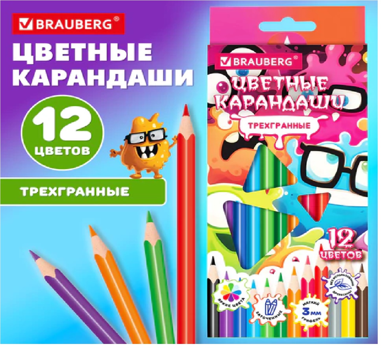Цветные карандаши BRAUBERG CUTE MONSTERS – это мягкие грифели, насыщенные цвета, прочный корпус. Идеально для творчества, учебы и работы.Набор состоит из 12 цветов: черный, синий, голубой, салатовый, зеленый, желтый, оранжевый, розовый, красный, серый, фиолетовый, коричневый.Трехгранная форма сечения корпуса позволяет не скатываться карандашу с поверхности стола во время занятий рисованием. Карандаши изготовлены из высококачественного материала и имеют лакированный корпус. Качество исполнения гарантирует легкую заточку. Грифель обладает повышенной прочностью. Все карандаши заточены и поставляются в красочной картонной упаковке с европодвесом.Цветные карандаши BRAUBERG CUTE MONSTERS – это 12 сочных оттенков в одном наборе. Мягкие грифели, прочные корпуса, идеальная заточка. Для художников любого уровня – от первых детских рисунков до профессиональных работ. Подарите себе радость творчества – рисуйте легко и с удовольствием!