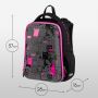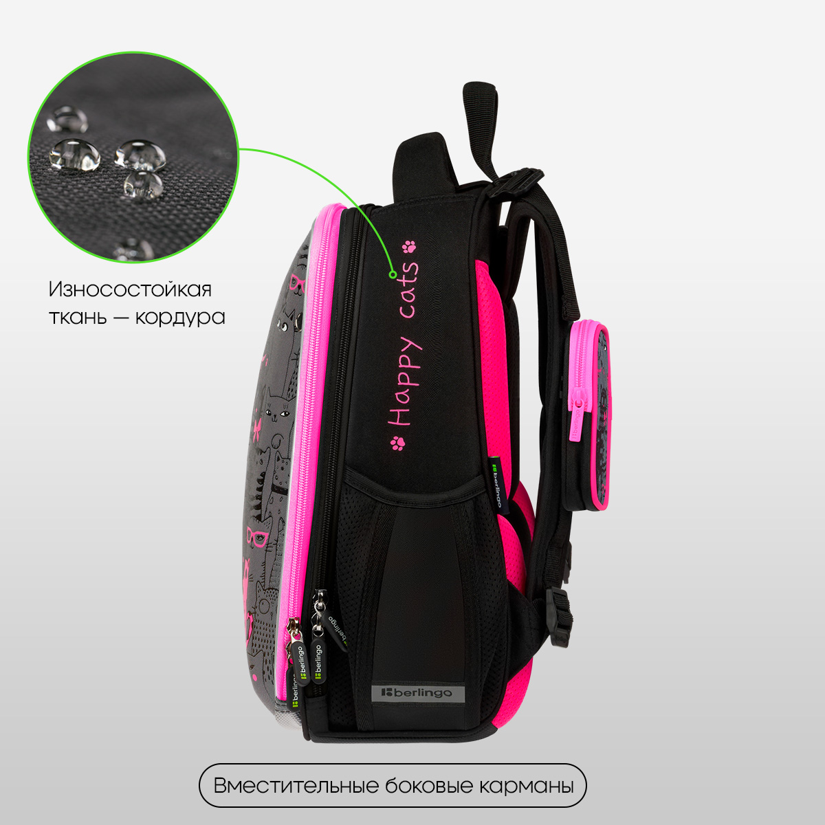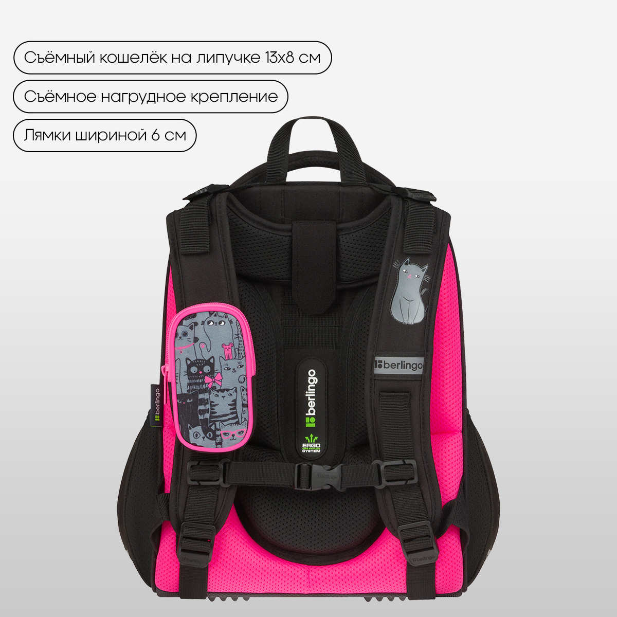 Ранец имеет 2 отделения, 2 боковых кармана на резинке, съемный кошелек на лямке для быстрого доступа к необходимым вещам. Внутри предусмотрены разделители для учебных пособий, органайзер для письменных принадлежностей, карман для мобильного телефона, съемный карабин для ключей и именная карточка для подписи.