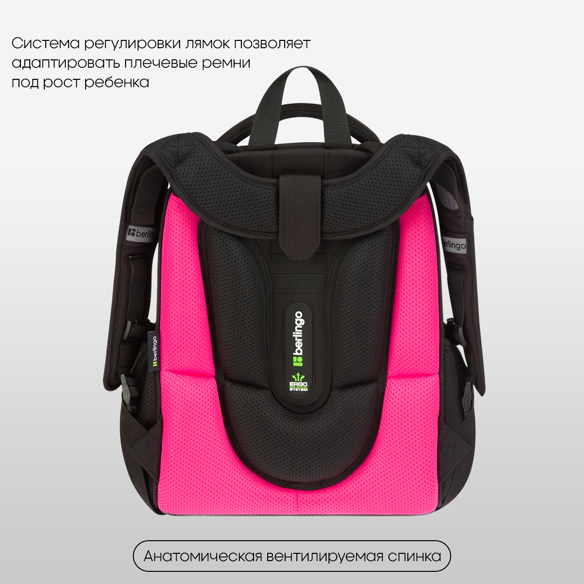 Благодаря анатомической вентилируемой спинке, регулируемым по длине и высоте лямкам, а также нагрудному креплению ранец плотно фиксируется на спине ребенка, что помогает равномерно распределить нагрузку и сохранить правильную осанку. Уплотненная мягкая ручка и петля для подвешивания к парте делают ранец очень удобным. Дно выполнено из водонепроницаемого материала с пластиковыми ножками для защиты от влаги. Световозвращающие элементы на лямках, передней и боковых частях ранца обеспечивают безопасность ребенка в темное время суток. Вес ранца менее 1 кг.