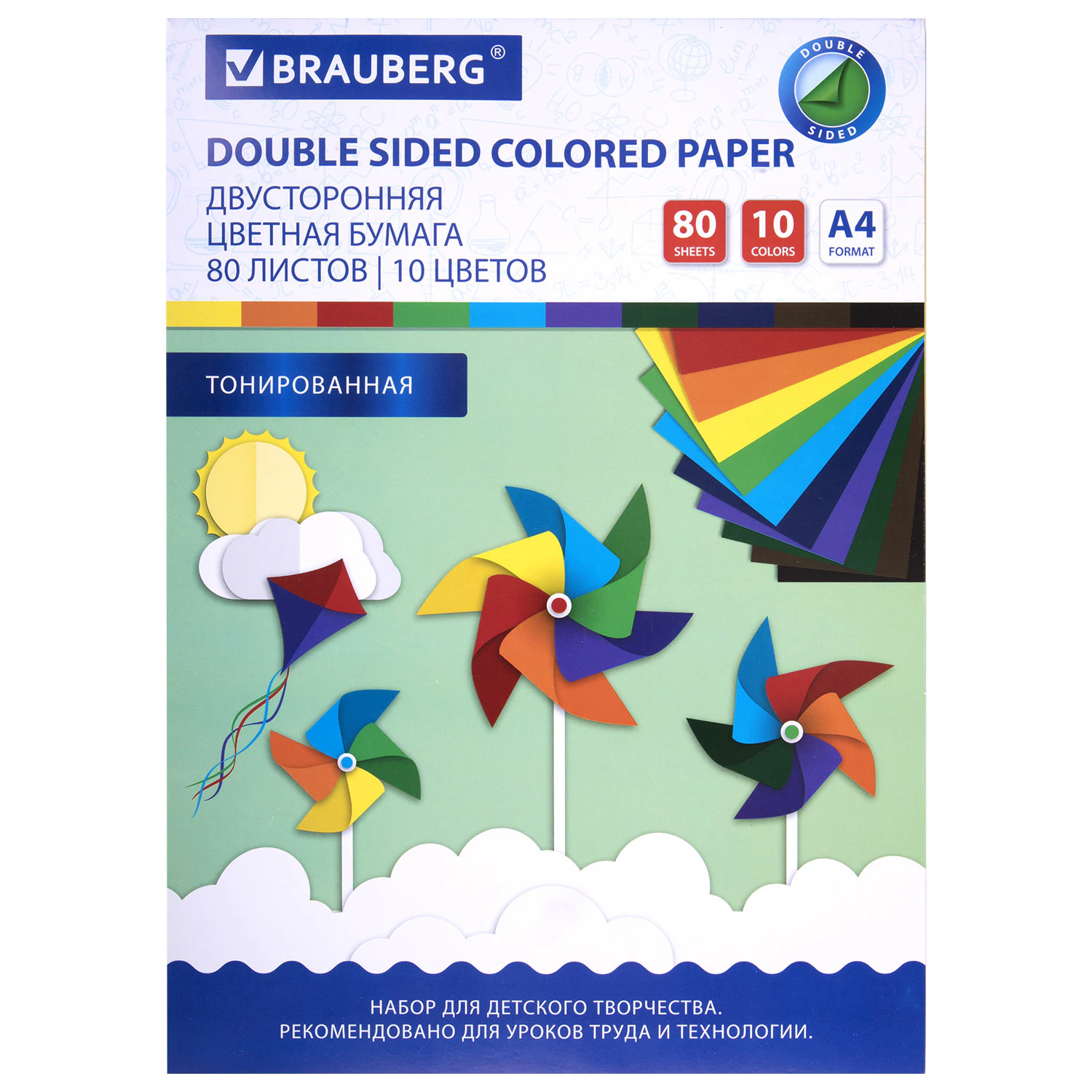 Набор цветной двухсторонней тонированной бумаги BRAUBERG предназначен для творчества, хобби, моделирования. Подходит для детей в возрасте от 3 лет, для развития моторики и фантазии.Немелованная двусторонняя цветная бумага окрашивается непосредственно в процессе изготовления и обладает плотностью 80 г/м2. Набор включает 80 листов формата А4 (210х297 мм) в 10-ти разнообразных и насыщенных однородных цветах. Листы скреплены при помощи альбомной склейки, легко режутся и сгибаются.