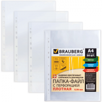 Папки-файлы А4 вкладыш с перфорацией, 60 мкм, 50 шт./упак., BRAUBERG, ПЛОТНЫЕ, гладкие