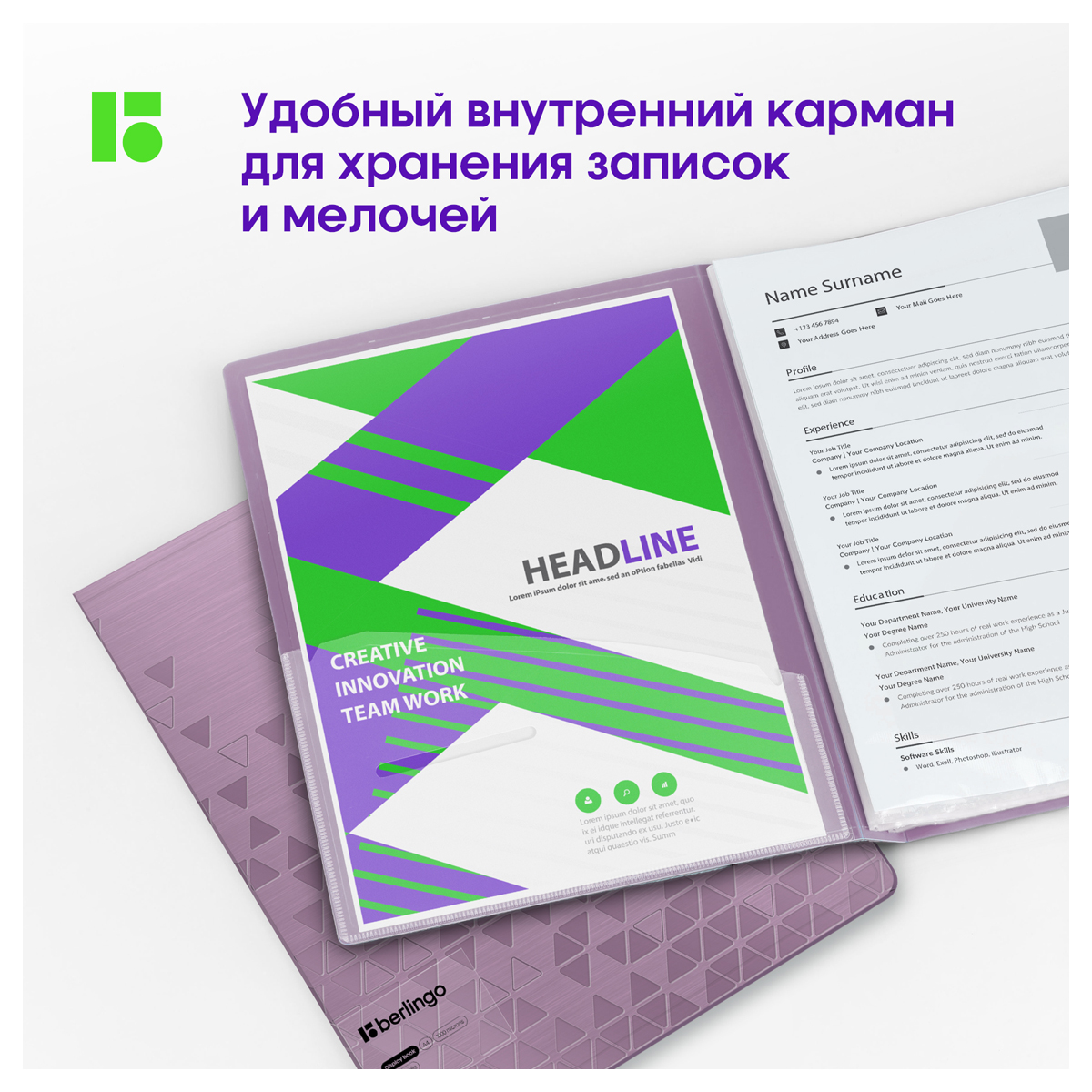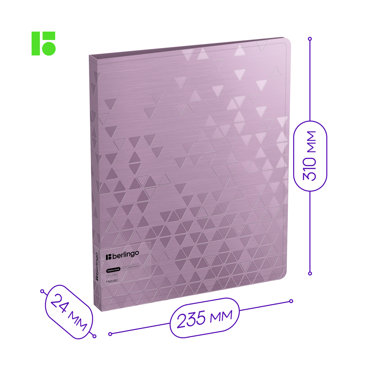 Описание: Папка Berlingo Metallic с 40 вкладышами формата А4 станет ярким помощником для хранения документов. Размер изделия – 310*235*24 мм, ширина корешка – 24 мм, толщина материала – 1000 мкм. Папка вмещает до 100 бумажных листов. Листы-карманы увеличенной толщины 30 мкм надежно скреплены сваркой. Папка изготовлена из высококачественного полипропилена с матовой текстурой поверхности «рельефные треугольники», на которой не видно отпечатков пальцев и мелких царапин. Сиреневый металлический оттенок папки будет изысканно смотреться на любом рабочем месте. Внутренняя сторона оснащена плотным прозрачным карманом для удобного хранения мелочей: ручки, заметок, визиток, дисков, флешек и другого. Упакована в индивидуальный прозрачный пакет • Формат: А4; • Количество вкладышей: 40; • Ширина корешка: 24 мм; • Толщина материала: 1000 мкм; • Тип скрепления: термосварка; • Размер: 310*235*24 мм; • Цвет: сиреневый металлик