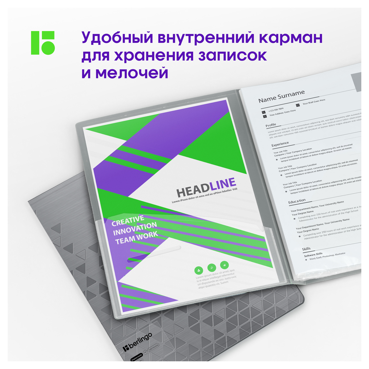 Описание: Папка Berlingo Metallic с 40 вкладышами формата А4 станет ярким помощником для хранения документов. Размер изделия – 310*235*24 мм, ширина корешка – 24 мм, толщина материала – 1000 мкм. Папка вмещает до 100 бумажных листов. Листы-карманы увеличенной толщины 30 мкм надежно скреплены сваркой. Папка изготовлена из высококачественного полипропилена с матовой текстурой поверхности «рельефные треугольники», на которой не видно отпечатков пальцев и мелких царапин. Серебряный металлический оттенок папки будет изысканно смотреться на любом рабочем месте. Внутренняя сторона оснащена плотным прозрачным карманом для удобного хранения мелочей: ручки, заметок, визиток, дисков, флешек и другого. Упакована в индивидуальный прозрачный пакет • Формат: А4; • Количество вкладышей: 40; • Ширина корешка: 24 мм; • Толщина материала: 1000 мкм; • Тип скрепления: термосварка; • Размер: 310*235*24 мм; • Цвет: серебряный металлик