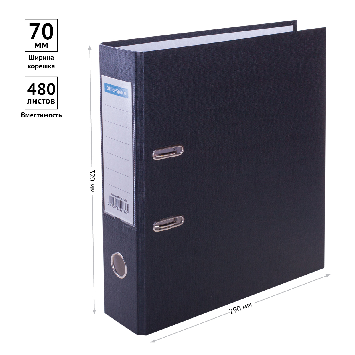 Папка-регистратор для хранения документов, металлический арочный механизм, покрытие бумвинил, карман на корешке папки. Формат А4+. Размер составляет 280*310*70мм. Ширина корешка 70 мм. Цвет чёрный. • Размер: 280*310*70мм; • Формат: А4; • Цвет: чёрный; • Вместимость в листах: 480шт; • Ширина корешка: 70мм.