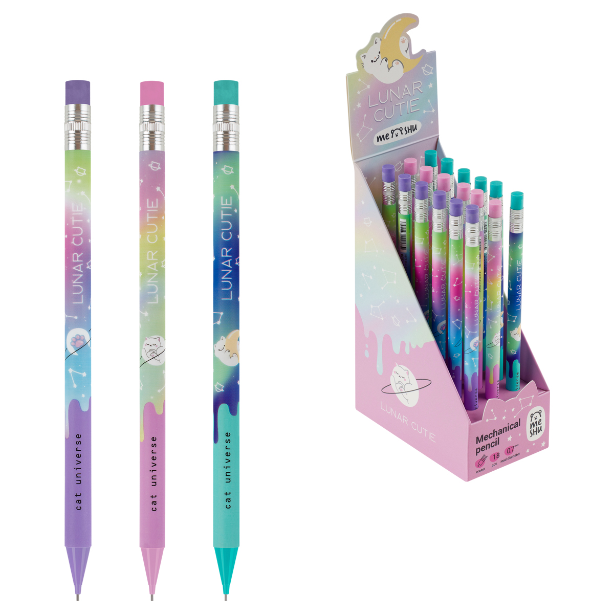 Механические карандаши с печатью на корпусе и ластиком MESHU Cat Universe станут отличными помощниками в школе или офисе. Круглый корпус выполнен в стильных, ярких дизайнах, рисунки нанесены высококачественной термотрансферной печатью. Диаметр грифеля – 0,7 мм, твердость – HB, материал корпуса – пластик. Карандаши упакованы в картонный дисплей-бокс по 18 штук. Подача грифеля осуществляется с помощью кнопочного механизма. Стильные яркие дизайны понравятся всем любителям милой и забавной канцелярии. • Твердость: HB; • Форма корпуса: круглая; • Наличие ластика: да; • Цвет корпуса: ассорти; • Количество штук в упаковке: 18; • Тип упаковки: картонный дисплей-бокс.