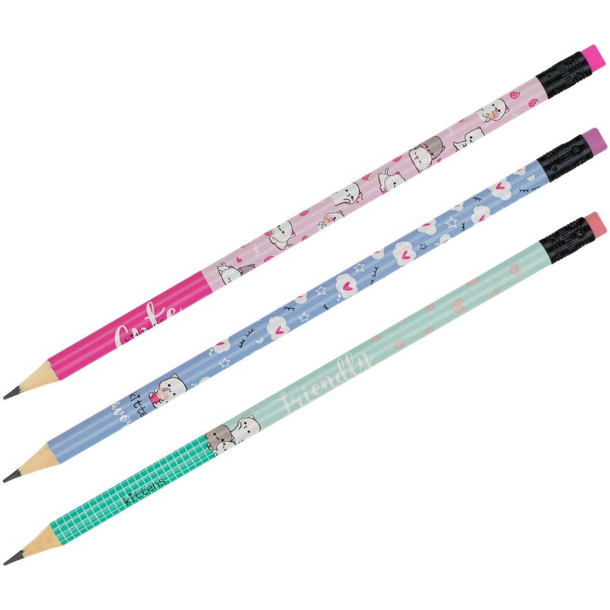 Чернографитные карандаши MESHU "Kittens" с печатью на корпусе и цветным ластиком — аксессуары, которые не дадут заскучать на учёбе или работе. Они представлены в круглом корпусе с тремя разными дизайнами. Твёрдость грифеля — HB. Длина карандаша — 190 мм. Диаметр — 2,2 мм. Карандаши из светлого дерева отлично подходят для черчения и рисования. Они легко затачиваются, мягко пишут и оставляют яркий след. Карандаши пакованы в пластиковую прозрачную тубу по 28 штук. Они уже заточены и готовы к работе. • Диаметр грифеля: 2,2 мм; • Твердость: HB; • Форма корпуса: круглая; • Наличие ластика: да; • Цвет дерева: светлый; • Цвет корпуса: ассорти; • Количество штук в упаковке: 28; • Тип упаковки: пластиковая туба.