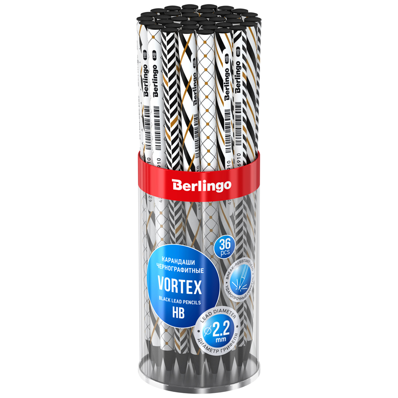 Описание: Чернографитный ударопрочный карандаш Berlingo "Vortex" из черного дерева с заточкой. Матовое покрытие корпуса, дизайны ассорти. Не ломается при падении. Безопасен для детей, в случае разлома, не оставляет мелких и острых фрагментов. Подходит для черчения и рисования. Диаметр грифеля 2,2 мм, твердость HB, круглая форма, штрих-код на корпусе. Упаковка в прозрачную разъемную ПВХ-тубу с возможностью использования в качестве подставки.