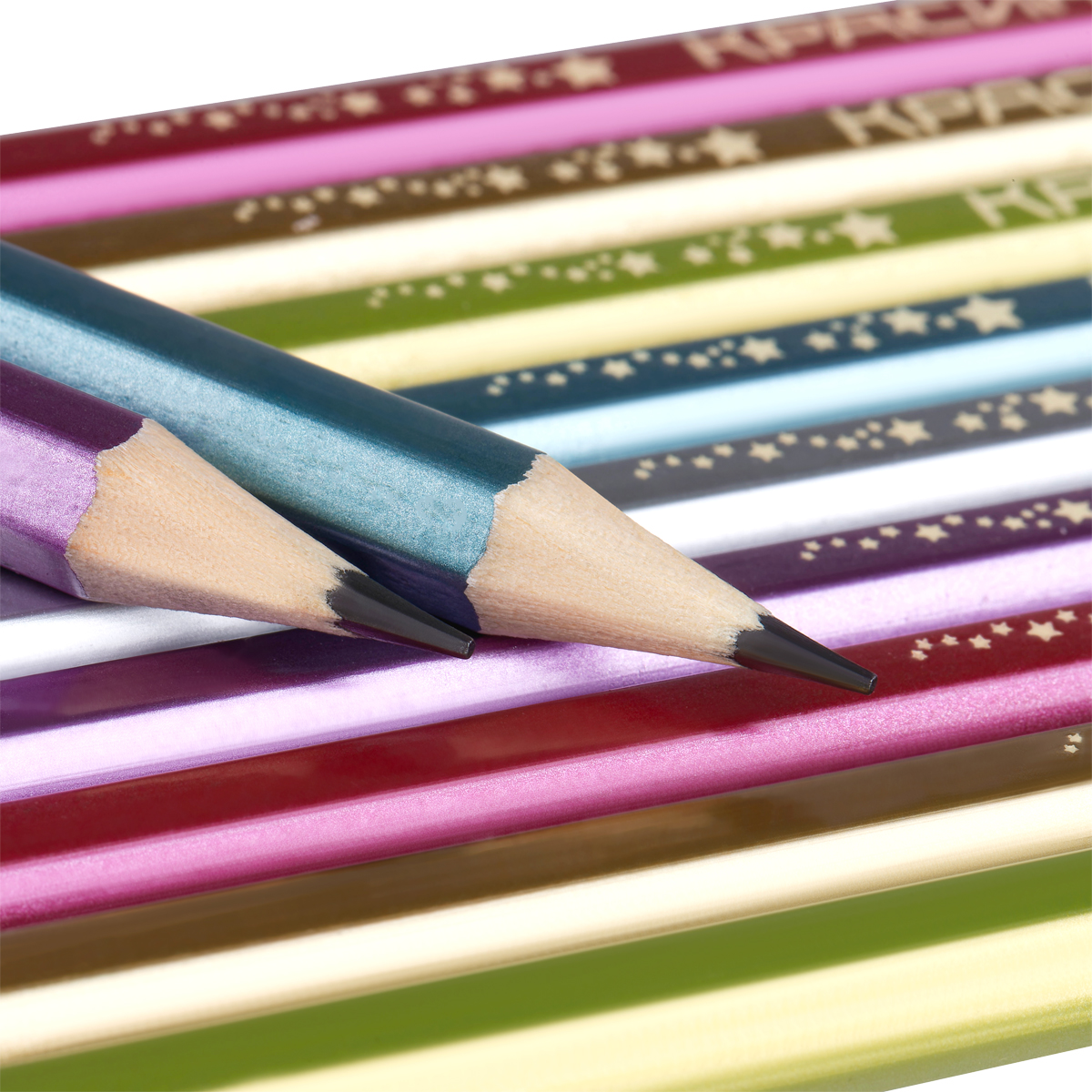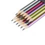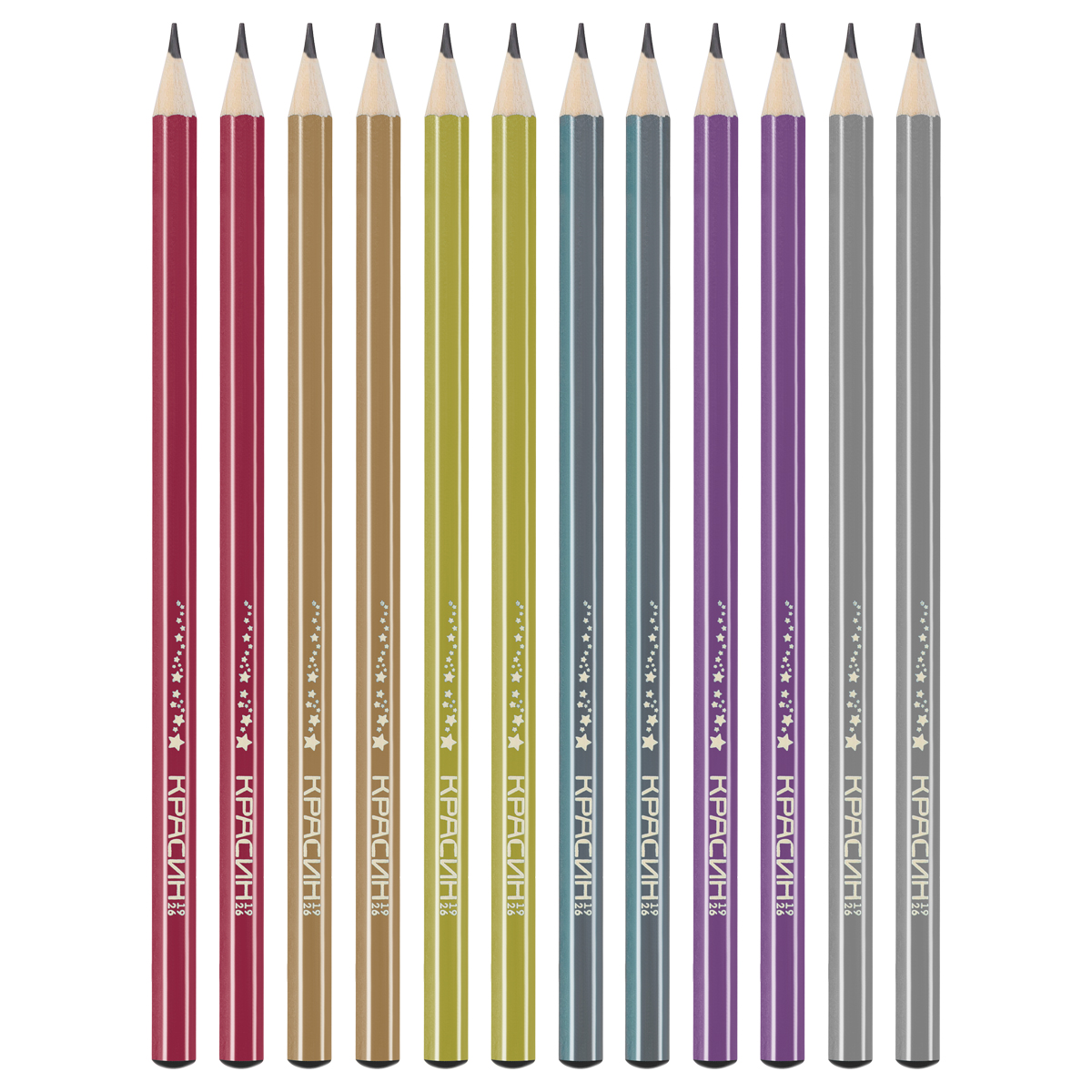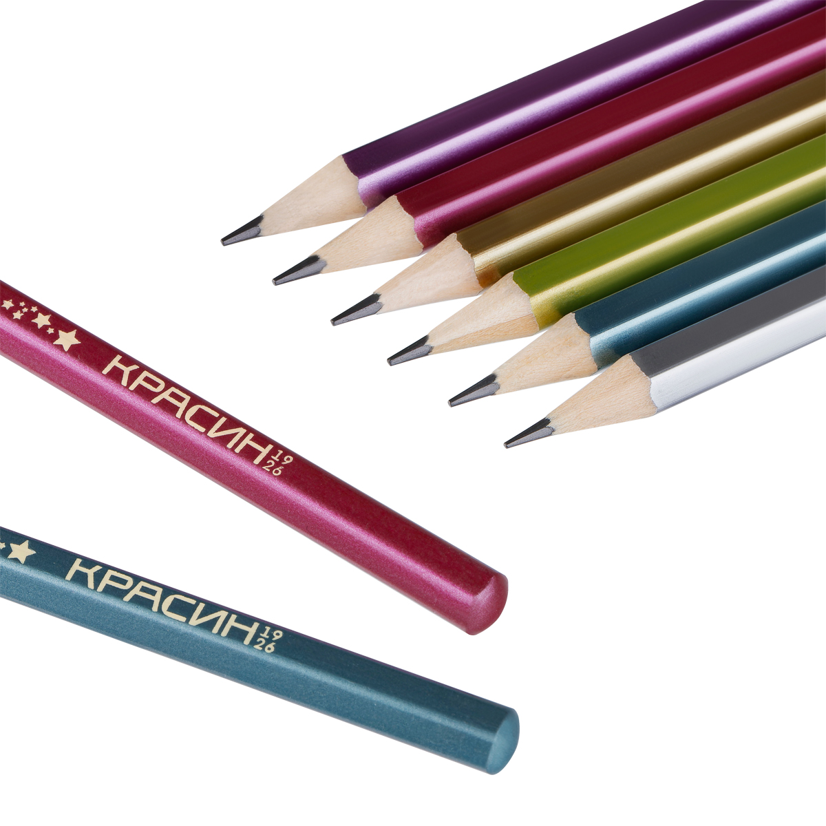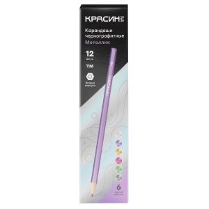 Описание: Карандаши чернографитные «Красин» серии «Металлик». Ассорти из шести цветов корпуса с эффектами металлик: золотой, серебряный, сиреневый, розовый, голубой, зеленый. Корпус выполнен из древесины липы высокого качества. Карандаши легко затачиваются и устойчивы к повреждениям. Качественный состав грифеля обеспечивает мягкое письмо, яркую и однородную линию на бумаге, легко стирается ластиком. Карандаши имеют удобную шестигранную форму. Карандаши поставляются в картонной коробке по 12 штук, на каждом есть индивидуальный штрих-код на корпусе.