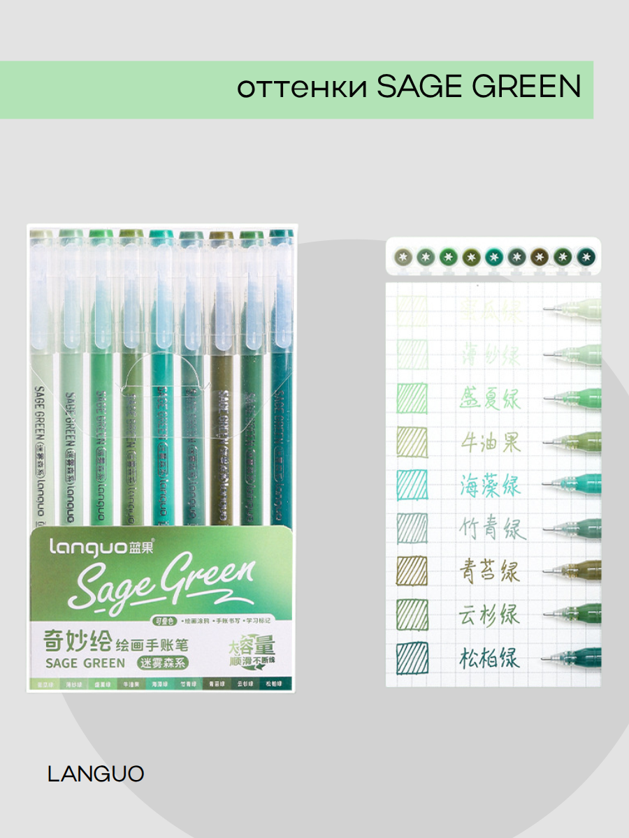 Ручки гелевые набор- 9 цв. DL-539 "Теплый зеленый" 0,6мм, игольчатый стержень, прозрачный корпус, в уп ПВХ LG-D0574 334534