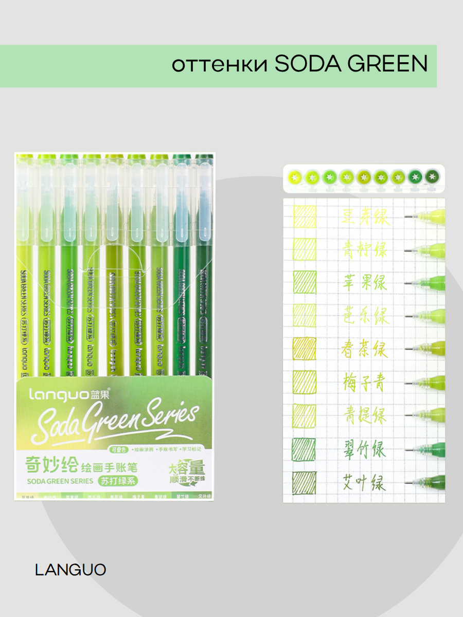 Ручки гелевые 9 цв. DO-590 "Зеленые" 0,6мм, игольчатый стержень, прозрачный корпус, в уп ПВХ LG-D0577 335637