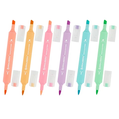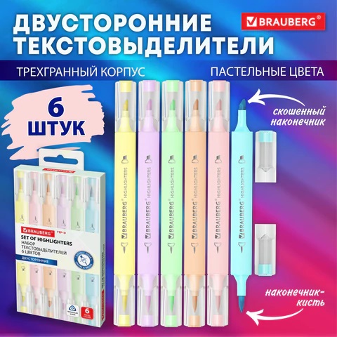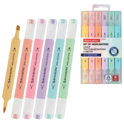 Двусторонние текстовыделители BRAUBERG TIP-D предназначены для выделения текста на бумаге любого типа. Идеально подходят для решения учебных, домашних и офисных задач.В наборе 6 двусторонних текстовыделителей пастельных цветов: ванильный, мятный, пастельный розовый, бирюзовый, лавандовый и персиковый. Нежные пастельные цвета позволяют создать мягкие переходы и равномерно подчеркнуть необходимую информацию в тексте. Цвет корпуса соответствует цвету чернил.Текстовыделители имеют корпус треугольной формы диаметром 13 мм. Одна сторона имеет скошенный наконечник с линией письма от 1 до 5 мм, что обеспечивает ровное непрерывное нанесение при работе с напечатанным мелким шрифтом текстом или таблицами. Вторая сторона имеет наконечник в виде кисти, что позволяет рисовать или закрашивать различные рисунки или надписи.Благодаря особой водной основе чернил текстовыделители не высыхают без колпачка в течение 8 часов. Текстовыделители обладают экономным расходом чернил, не портят бумагу, не смазывают текст и не просвечиваются.Выделяйте важное, структурируйте информацию, читайте с комфортом – в этом вам поможет набор текстовыделителей BRAUBERG TIP-D!