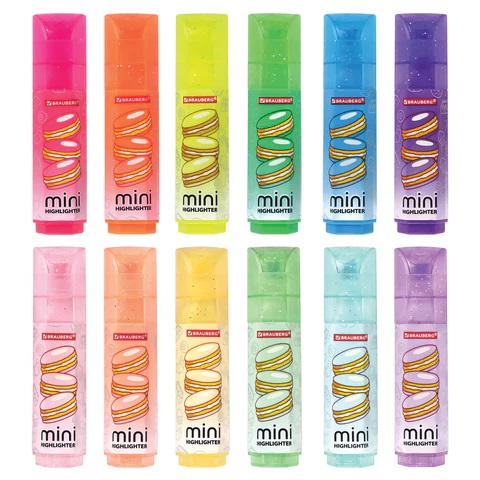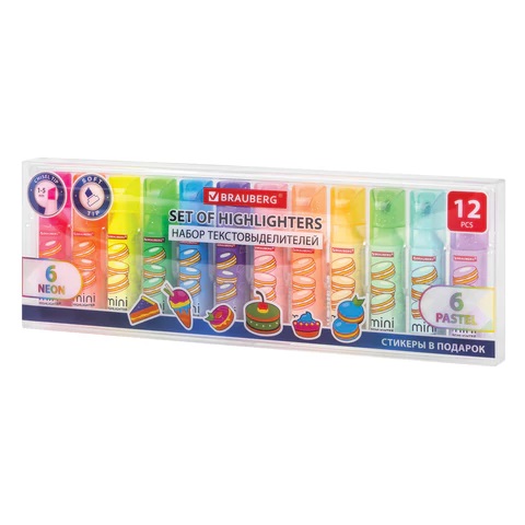 Набор текстовыделителей мини с принтами BRAUBERG предназначен для выделения текста на бумаге любого типа. Идеально подходит для решения учебных и домашних задач.12 цветов в наборе:• 6 пастельных – мятный, песочный, лавандовый, персиковый, бирюзовый, пастельный розовый;• 6 неоновых – зеленый, желтый, фиолетовый, оранжевый, голубой и розовый.Неоновые цвета позволяют ярко выделить важное в тексте, а особые пастельные оттенки создают мягкие переходы и равномерно подчеркивают необходимую информацию. В набор также входят 6 стикеров в подарок для оформления конспектов и записей. Текстовыделители имеют прямоугольную форму корпуса диаметром 20 мм. Мягкий скошенный наконечник имеет толщину линии письма от 1 до 5 мм, что обеспечивает удобство при работе с текстом, напечатанным мелким шрифтом, или таблицами.Благодаря особой водной основе чернил текстовыделители не высыхают без колпачка в течение 8 часов. Текстовыделители обладают экономным расходом чернил, при этом длина линии письма достигает 300 метров. Чернила быстро впитываются и тем самым предотвращают размазывание в процессе использования. Цвет колпачка и корпуса соответствует цвету чернил. Необычный колпак с блестками отлично дополняется яркими принтами.Текстовыделители мини – ваш ключ к эффективной работе с текстом! Выделяйте важное, структурируйте информацию, читайте с комфортом – в этом вам поможет набор текстовыделителей мини BRAUBERG!