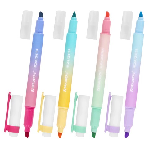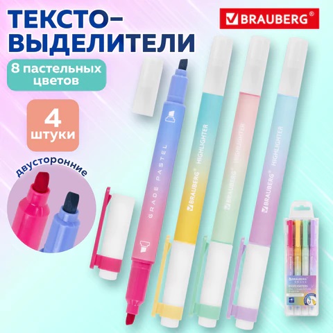 Текстовыделители двусторонние BRAUBERG "GRADE" предназначены для выделения текста на бумаге любого типа, включая факс-бумагу. Идеально подходят для учебных, домашних и офисных задач.В наборе – 4 двусторонних текстовыделителя 8-ми пастельных цветов: лавандовый, бирюзовый, мятный, пастельный розовый, ванильный, небесно-голубой, винный и пастельный синий. Имеют корпус круглой формы диаметром 11 мм.Скошенный наконечник имеет толщину линии письма от 1 до 4 мм, что обеспечивает удобство при работе с текстом, напечатанным мелким шрифтом, или таблицами. Текстовыделитель обладает экономным расходом чернил. Благодаря особой водной основе чернил текстовыделители не высыхают без колпачка в течение 8 часов. Изделие не перезаправляется. Цвет клипа соответствует цвету чернил.Двусторонние текстовыделители BRAUBERG GRADE - идеальный выбор для заметок в журнале, скрапбукинга и прочих творческих идей, замысловатых заголовков и списков задач, календарей, ежемесячных целей и трекеров настроения! Закажите текстовыделители BRAUBERG по выгодной цене!