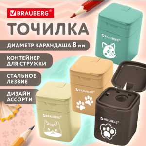 Описание: Точилка BRAUBERG "МИЛЫЕ КОТЫ" – незаменимый помощник для юных художников!Точилка прямоугольной формы с контейнером для сбора стружки. Корпус выполнен из пластика. Острое стальное лезвие продуманной конструкции обеспечивает быстрое и безопасное затачивание без повреждения грифеля. Точилка предназначена для цветных и чернографитных карандашей стандартного диаметра. Отверстие для карандаша закрывается крышкой.Выполнена в четырех цветах ассорти (без возможности выбора цвета). Компактная и эргономичная, эта точилка с легкостью поместится в любой пенал и не потеряется на рабочем столе, а оригинальный дизайн поможет в игровой форме освоить навык затачивания карандашей. Размер – 34х26х24 мм.