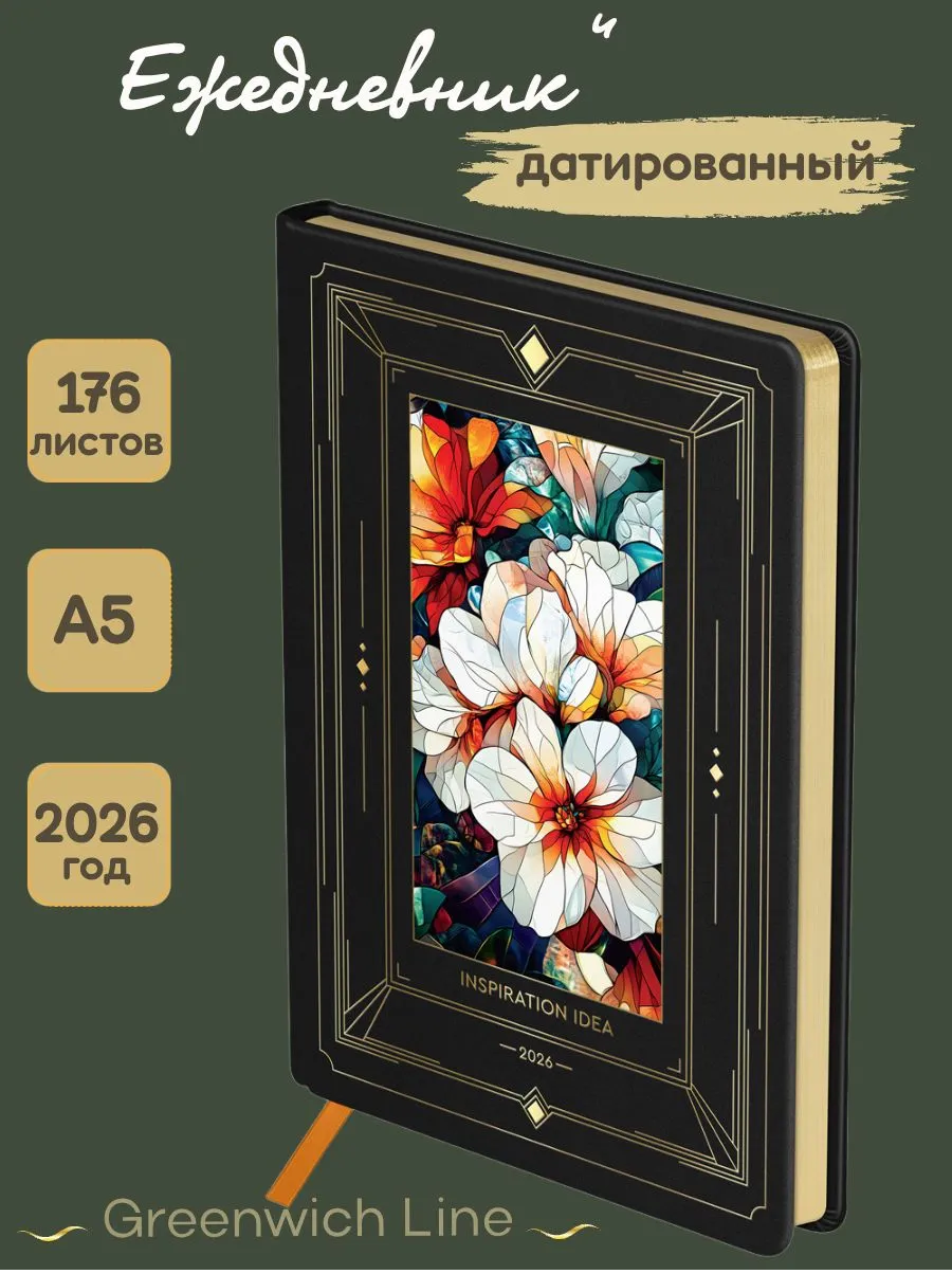 Прикоснитесь к изысканности с новыми ежедневниками Grenwich Line, облаченными в роскошную черную кожаную обложку. Сквозь прямоугольное окно словно пробивается свет, создавая эффект настоящего витража. Яркие цветы каждое утро напомнят о красоте жизни, вдохновляя на создание новых планов и достижение целей. Этот визуальный акцент не только радует глаз, но и создает атмосферу, в которой уютно и комфортно думать о будущих свершениях. Аккуратные линии для записей, разные разделы для планирования и заметок — всё создано для вашего удобства. Все детали продуманы так, чтобы поддерживать вдохновение и мотивацию на высоком уровне. Ежедневник Grenwich Line — пространство для новых идей. Пора взять управление в свои руки и сделать каждый день шагом на пути к жизни мечты. Содержит справочный материал и имеет закладку-ляссе. Имеет индивидуальную упаковку, что гарантирует его сохранность.