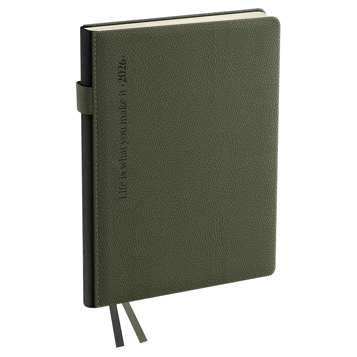 Ежедневник датированный на 2026 год BG серии "Palm" – идеальный компаньон для стильной и организованной жизни. Пухлая обложка с мягкой прослойкой выполнена из экокожи тёмно-зелёного цвета. Корешок в тон и мотивирующая фраза, нанесённая с помощью тиснения, придают стиль. Формат – А6 (105*145 мм). Изделие состоит из 176 листов тонированной бумаги плотностью 70 г/м2, которая подходит для любых типов ручек и не будет просвечиваться. В линованный блок с полем для даты и почасовым планингом удобно записывать встречи, идеи и задачи. Уголки листов с перфорацией. Две закладки-ляссе позволят быстро и легко найти нужную страницу, что делает навигацию по ежедневнику удобной и эффективной. Специальная петля из прочной резинки в цвет обложки подойдёт для фиксации ручек. В датированном ежедневнике предусмотрена справочная информация, ежемесячный планер, календарь и другие полезные сведения. Индивидуальная упаковка в термоусадочную пленку. Бренд предлагает функциональность и элегантный дизайн, которые делают ежедневники BG незаменимым инструментом для успешного планирования и организации. BG – с вами с 2001 года! • Формат: А6; • Размер: 105*145 мм; • Количество листов: 176; • Материал обложки: экокожа; • Цвет обложки: тёмно-зелёный.