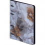 Обложка выполнена из искусственной кожи с элегантным рисунком и тиснением фольгой, что придаёт тетради стильный и роскошный вид. Внутри обложка защищена чёрным дизайнерским картоном плотностью 500 г/кв.м. Скруглённые уголки обложки помогают предотвратить повреждения при хранении в сумке. Внутренний блок состоит из 120 листов (240 страниц) белой офсетной бумаги плотностью 65 г/кв.м с клеточной линовкой и серыми линиями, что делает записи удобными и аккуратными. Размер листа — 14×20 см, белизна бумаги — 100%.