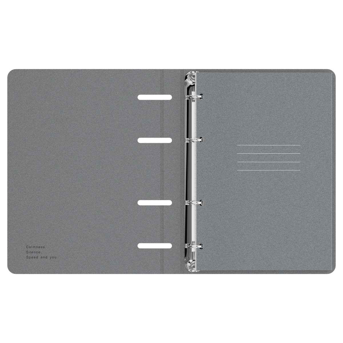 Механизм из 4 колец обеспечивает быструю смену или добавление листов при необходимости. Обложка сделана из плотного картона, который надёжно защищает внутренний блок. Отделка обложки — soft-touch ламинация. Тетрадь упакована в картон и индивидуальный пакет.
