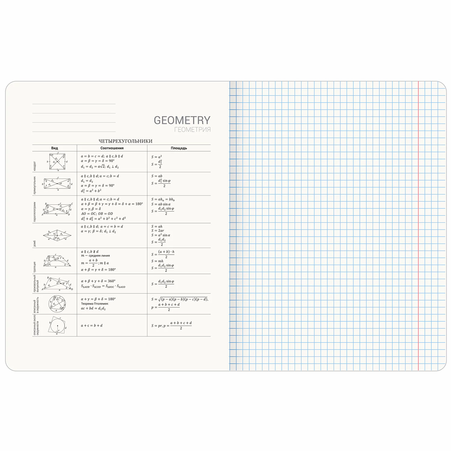 Предметная тетрадь BRAUBERG из серии "VINTAGE" предназначена для учащихся средних и старших классов. Выполнена в современном дизайне.Тетрадь по геометрии формата А5 (165х205 мм) содержит 48 листов, изготовленных из высококачественной офсетной бумаги плотностью 60 г/м2 и белизной 100%. Листы соединены скобами. Линовка блока – в клетку, красные поля. Обложка выполнена из мелованного картона плотностью 190 г/м2. Ламинация SoftTouch обеспечивает обложке мягкий, бархатистый тактильный эффект. Углы тетради скруглены. В справочном материале для учащихся собраны основные подсказки по школьному предмету.