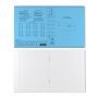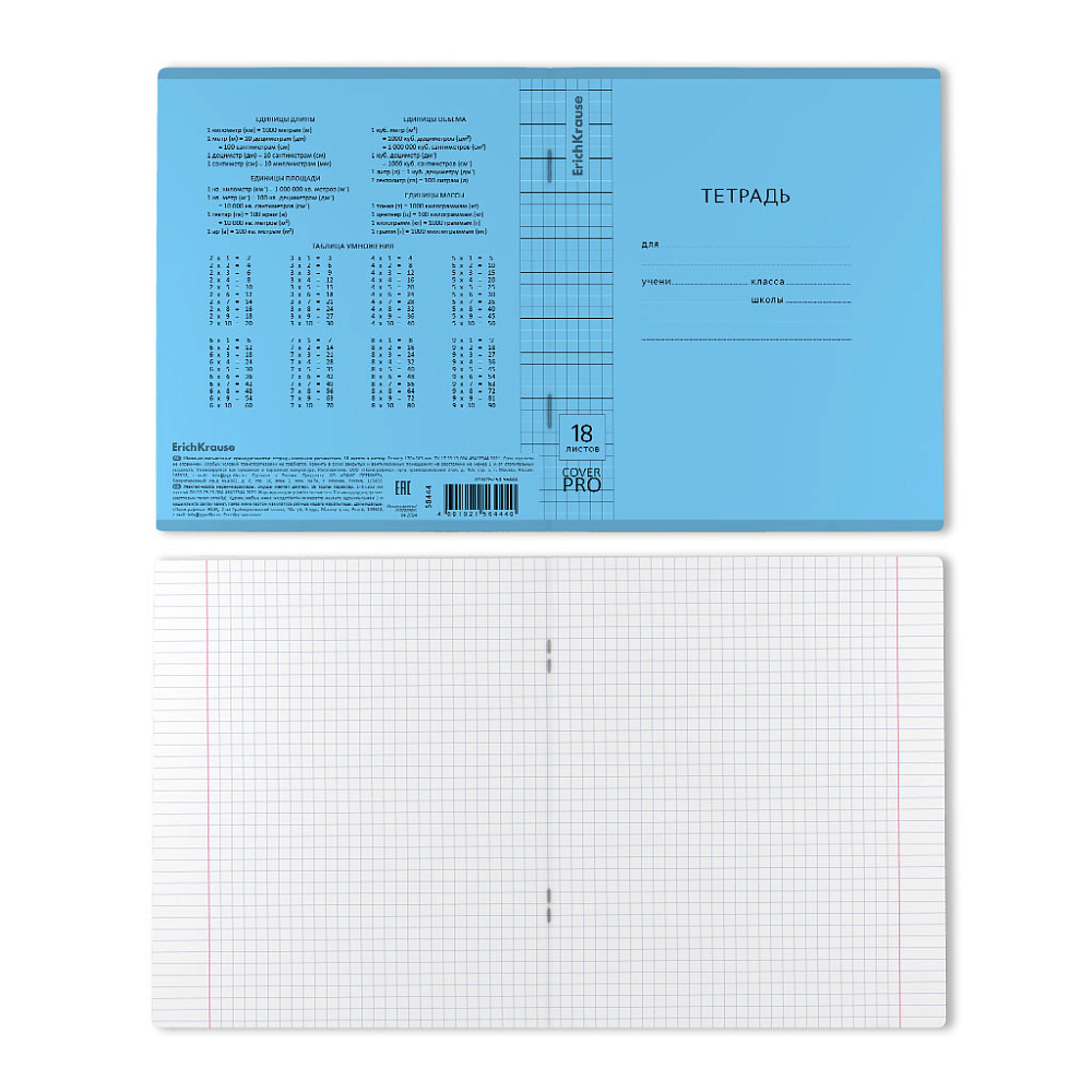 Тетрадь школьная ученическая формата А5+ (170x203 мм). Двойная обложка: внешняя выполнена из высококачественного износостойкого цветного пластика с фактурой «апельсиновая корка», внутренняя — из офсетной бумаги. В блоке 18 листов в клетку. Бумага офсетная плотностью 60 г/м2. Цвет линовки — синий. Скругленные уголки обложки и блока. Тип скрепления — скоба.