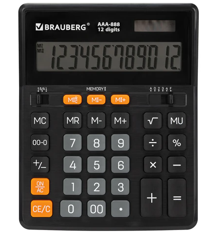 Настольный калькулятор BRAUBERG AAA-888. Большой дисплей с увеличенными символами, надежный корпус и оптимальный набор наиболее используемых функций для эффективной работы.Калькулятор поддерживает ключевые арифметические действия: возведение в степень, вычисления с процентами, извлечение квадратного корня, запоминание промежуточных результатов. Подходит для бухгалтеров благодаря наличию клавиш двойной памяти, "00" и MU для расчетов налогов и торговой наценки. С переключателями округления и положения десятичного знака.Большой двенадцатиразрядный дисплей с акриловым экраном комфортно отображает большие символы с высокой точностью округления. Встроенный аккумулятор и солнечная батарея позволяют калькулятору работать при любом освещении, а клавиша выключения OFF и функция автоматического отключения (через 8-10 минут бездействия) позволяют максимально продлить срок его службы без замены батареи.Размер – 202x159 мм.