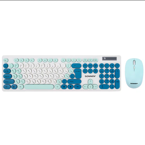 Описание: SONNEN K-650 – классический стильный комплект, сочетающий в себе функциональность, долговечность и исключительное удобство в работе. Внимание! Адаптер находится в отсеке для батареек клавиатуры!Беспроводное подключение: радиус действия – до 10 метров от компьютера или ноутбука. Клавиатура мембранного типа. Размер – 435,5х133х22 мм. Клавиатура имеет 104 основные клавиши.Также в комплект входит беспроводная мышь: 4 кнопки, разрешение сенсора (меняется с помощью дополнительной кнопки) – 800-1200-1600 dpi. Размеры – 60,2x32,5x110 мм.Питание клавиатуры – 1 батарея АА, мыши – 1 батарея АА (в комплект не входят!).Клавиатура и мышь выполнены в оригинальном дизайне. Цвет – белый / мятный / бирюзовый.Клавиатура + мышь SONNEN K-650 – классический беспроводной набор, который пригодится в работе, учебе, игре!