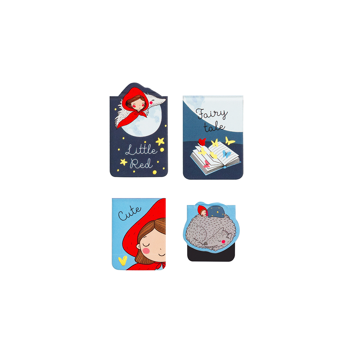 Магнитные закладки MESHU "Little red" помогут запомнить и быстро найти нужную страницу книги. В набор входят четыре аксессуара с разными дизайнами. Благодаря полностью магнитному основанию закладки надёжно фиксируются на страницах и не выпадают, даже если перевернуть книгу. Аксессуары сделаны из полимерных материалов. В отделке используется матовая ламинация и фольгирование. Набор упакован в пакет с европодвесом. Подложка продолжает общий дизайн набора. • Количество: 4 штуки; • Упаковка: пакет с европодвесом.