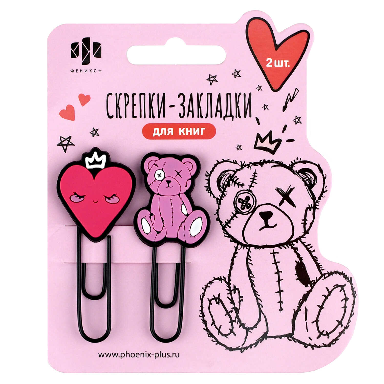 Скрепки-закладки для книг, арт. 71033 / 48 РОЗОВЫЙ МИКС (2 шт. в наборе, размер: 25х62 мм, материал: металл, ПВХ; цвет: чёрный, розовый, малиновый; особенности: наконечник фигурный из ПВХ, ПВХ-оплётка; индивидуальная упаковка: подложка с европодвесом из мелованного картона + ПЭТ-пакет