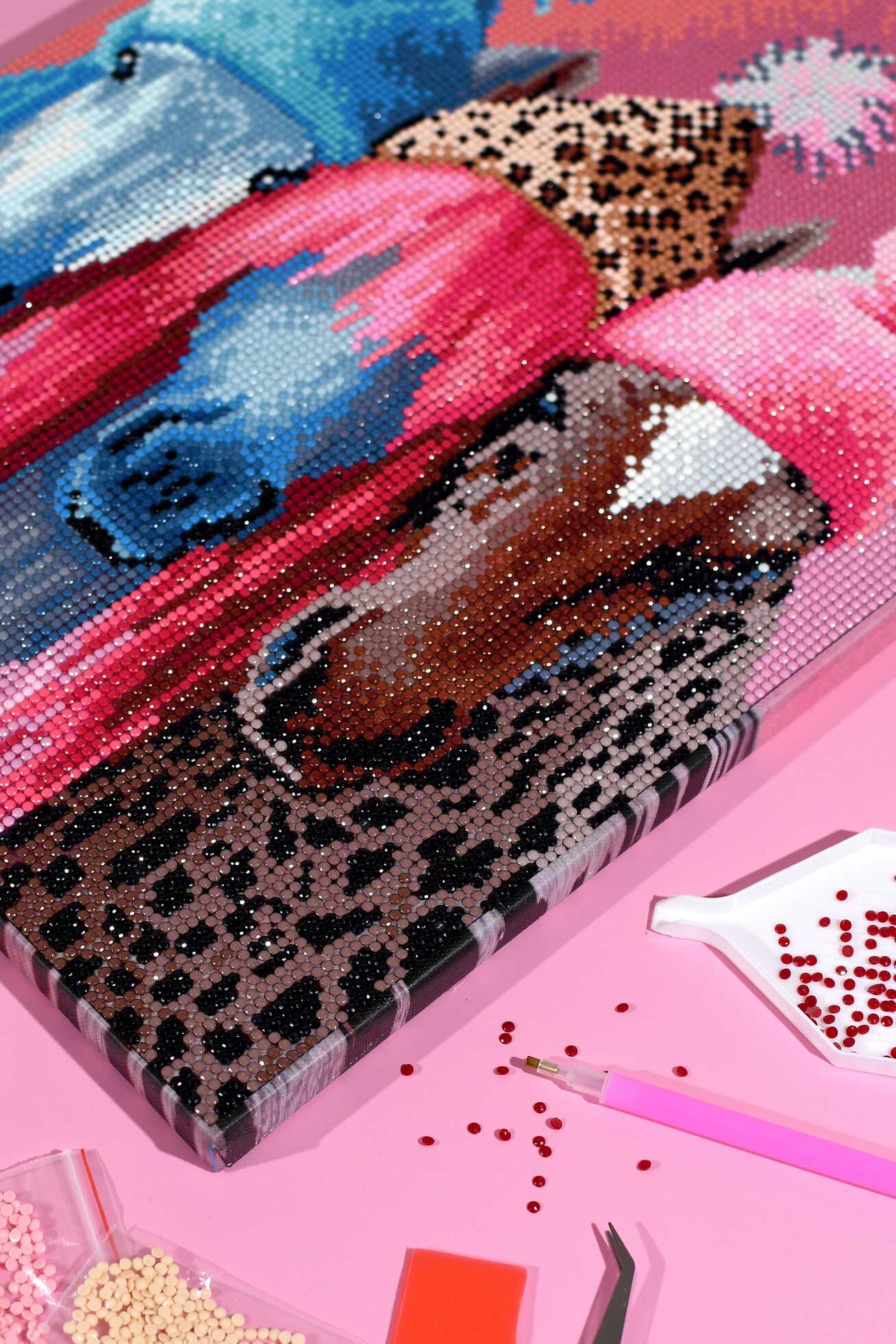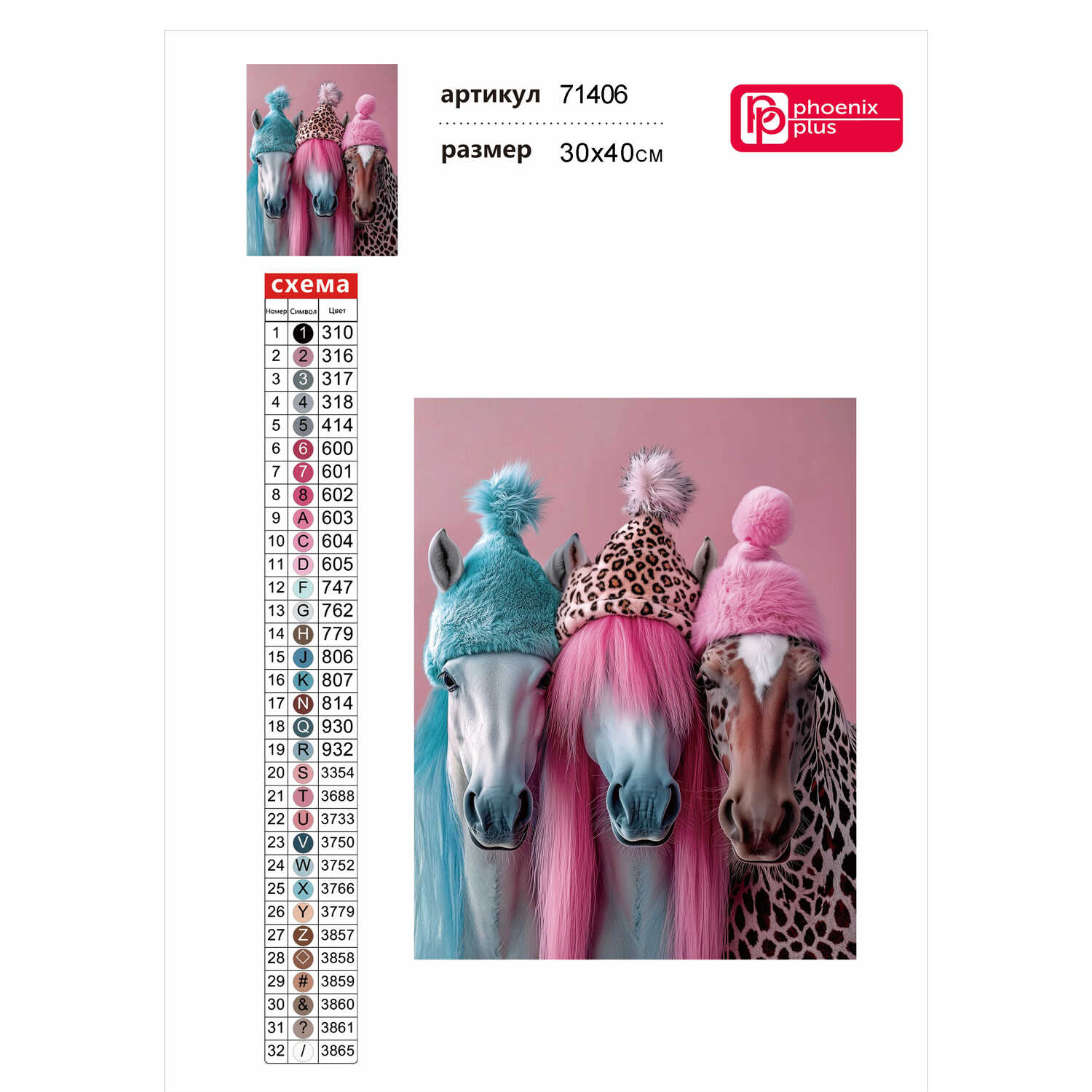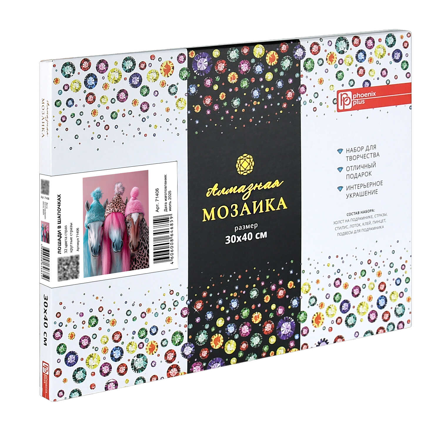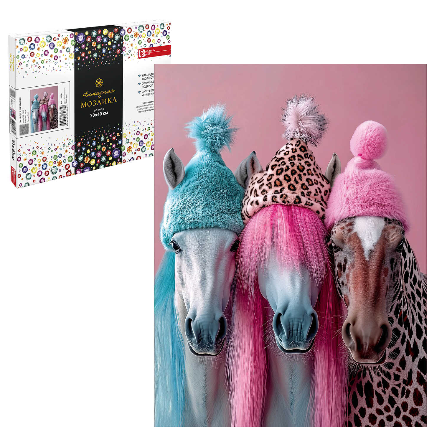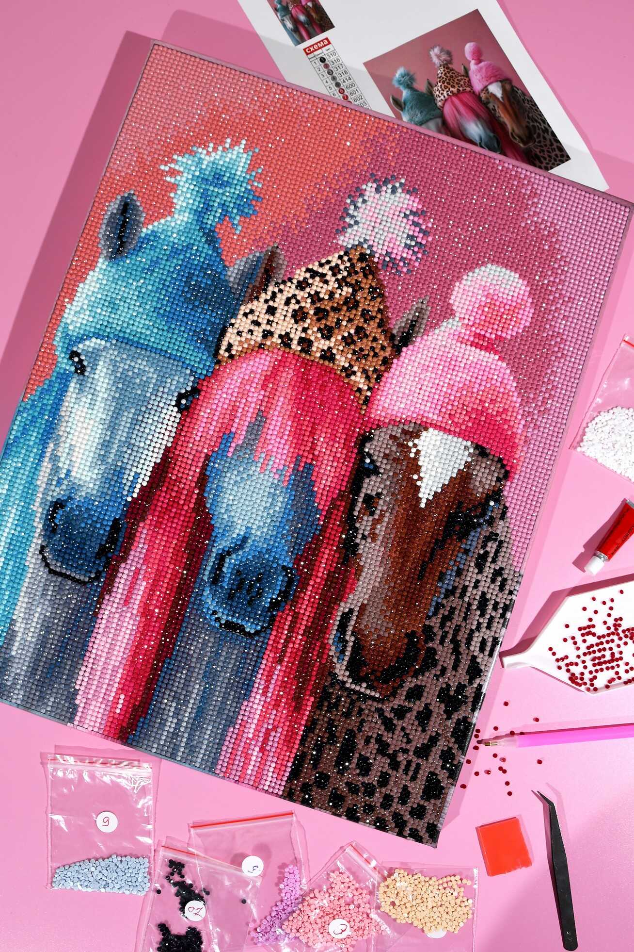 Алмазная мозаика (набор для творчества) арт. 71406 / 25 ЛОШАДИ В ШАПОЧКАХ, размер: 30*40 см, (32 цветов страз, холст на подрамнике с напечатанной картиной, покрытый клеевым слоем и защитной пленкой, пакеты со стразами, стилус, лоток для страз, силикон для страз, клей, подвесы для подрамника, пинцет металлический, схема, дополнительные пакеты с zip-молнией, стикеры для нумерации zip-пакетов в комплекте, форма страз: круглая, тип выкладки: полная, картонная коробка)