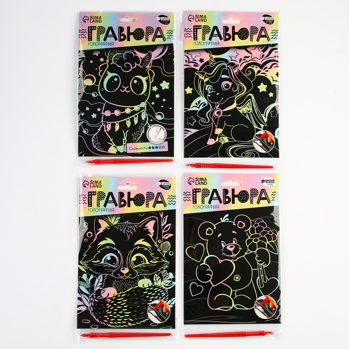 Чтобы создать красивую гравюру, достаточно процарапать намеченные контуры рисунка специальным инструментом — штихелем. Дети будут с удовольствием соскребать верхний слой картины по контурам рисунка, под которым находится цветное изображение!Особенности набора: