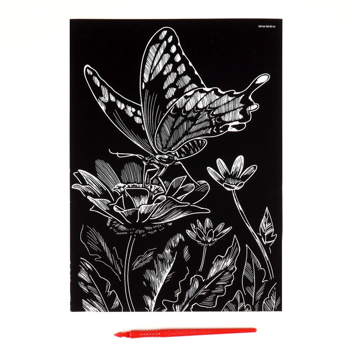 Гравюра на подложке «Бабочка на цветке» с металлическим эффектом «серебро» А4 — замечательный и оригинальный подарок, который понравится каждому любителю творчества!Чтобы создать невероятно красивую гравюру, достаточно процарапать намеченные контуры рисунка специальным инструментом — штихелем. И дети, и взрослые будут с удовольствием соскребать верхний слой гравюры с контурами будущей картины, под которым находится сверкающая фольга — ведь это так увлекательно!Чем полезно?При работе с набором у ребёнка развивается мелкая моторика и координация движений, формируются такие важные качества, как усидчивость, аккуратность и внимательность. Малыш натренирует руку к письму перед школой, ведь умение проводить точные линии непременно пригодится ему на уроках.Что входит в набор?