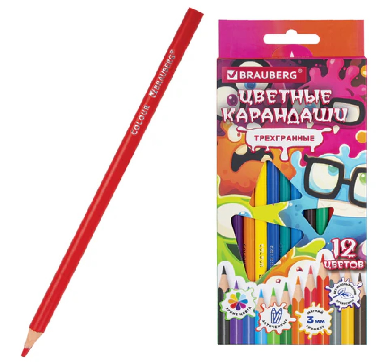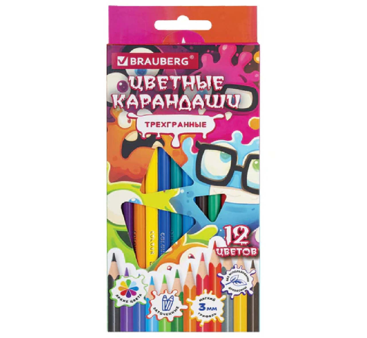 Цветные карандаши BRAUBERG CUTE MONSTERS – это мягкие грифели, насыщенные цвета, прочный корпус. Идеально для творчества, учебы и работы.Набор состоит из 12 цветов: черный, синий, голубой, салатовый, зеленый, желтый, оранжевый, розовый, красный, серый, фиолетовый, коричневый.Трехгранная форма сечения корпуса позволяет не скатываться карандашу с поверхности стола во время занятий рисованием. Карандаши изготовлены из высококачественного материала и имеют лакированный корпус. Качество исполнения гарантирует легкую заточку. Грифель обладает повышенной прочностью. Все карандаши заточены и поставляются в красочной картонной упаковке с европодвесом.Цветные карандаши BRAUBERG CUTE MONSTERS – это 12 сочных оттенков в одном наборе. Мягкие грифели, прочные корпуса, идеальная заточка. Для художников любого уровня – от первых детских рисунков до профессиональных работ. Подарите себе радость творчества – рисуйте легко и с удовольствием!