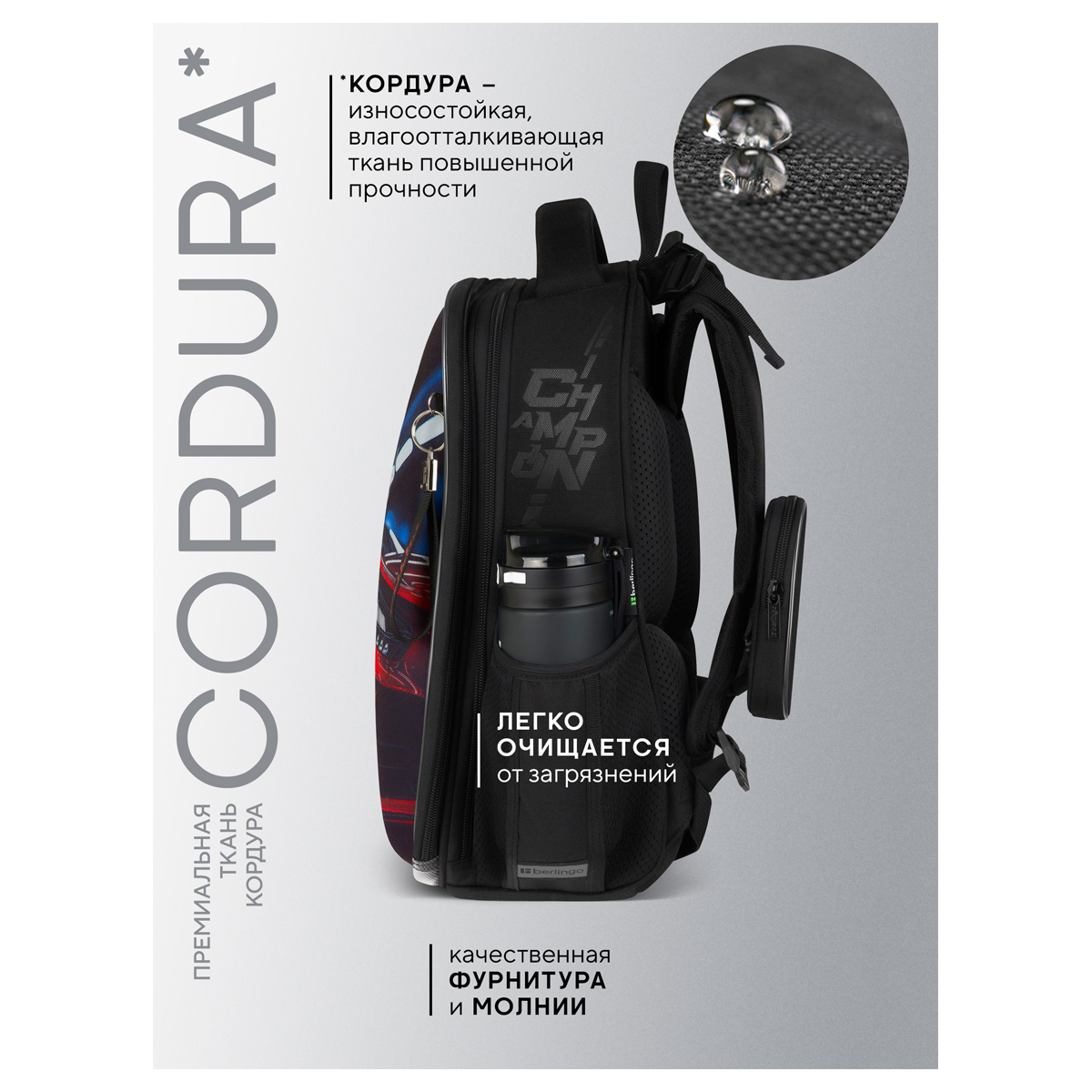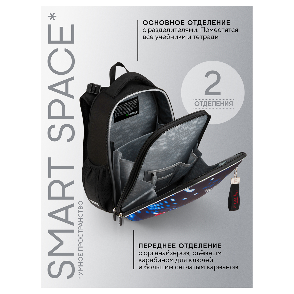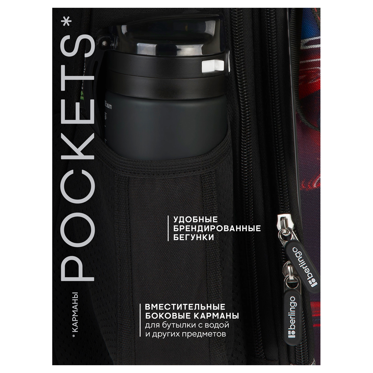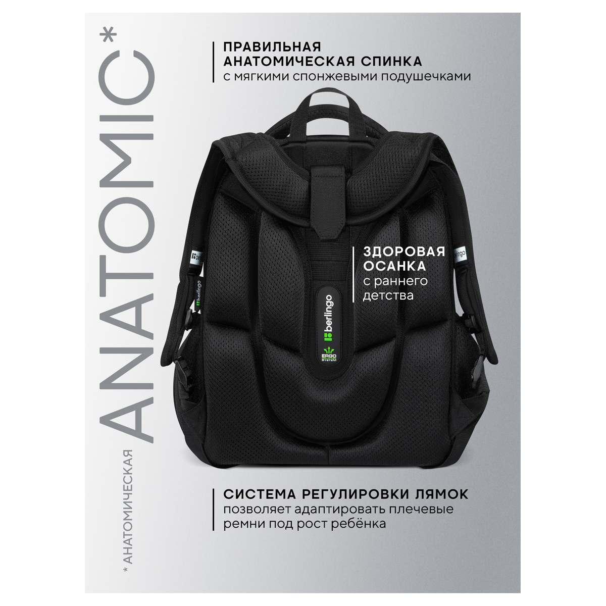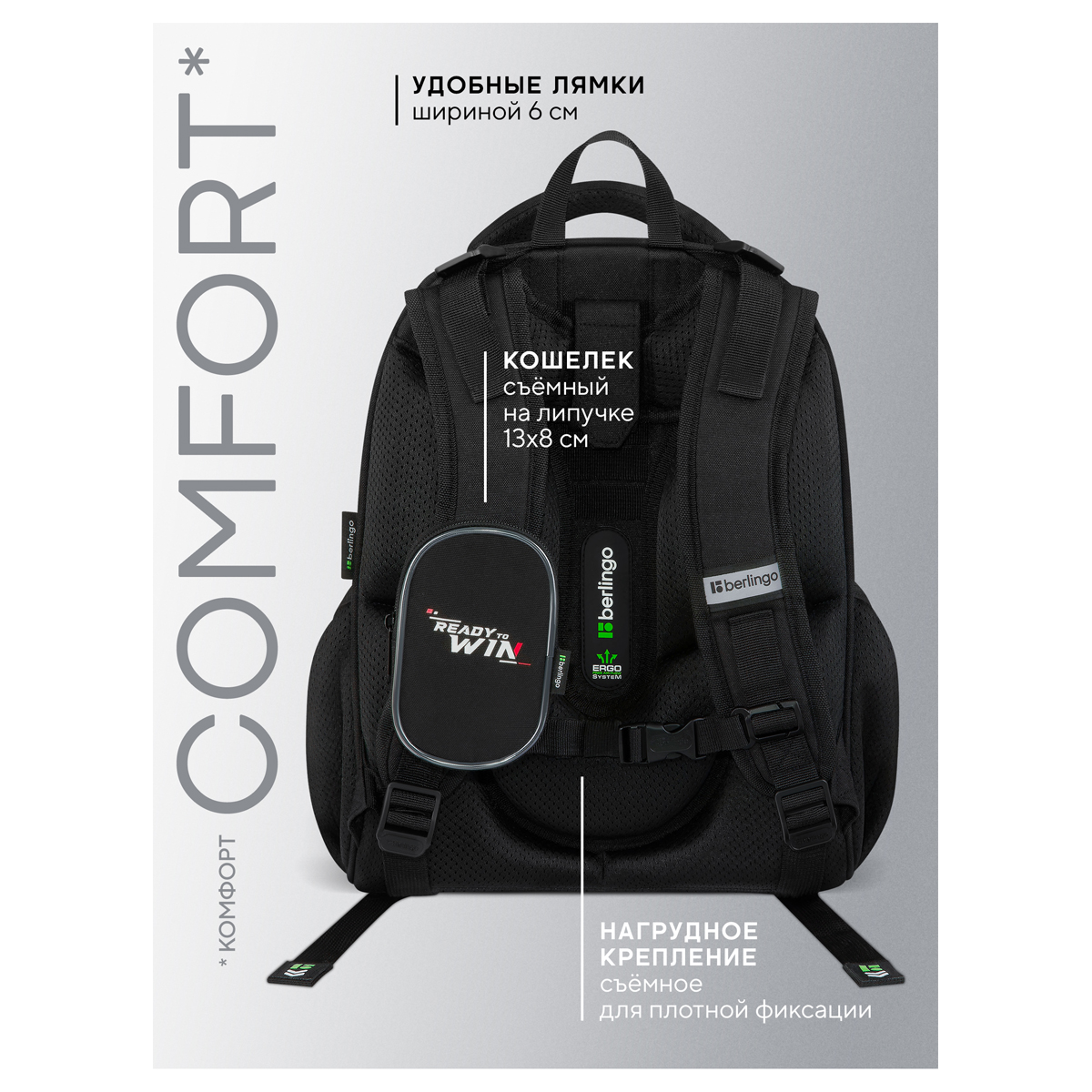 Эргономичный ранец Berlingo серии Expert размером 37*28*16 см подходит для детей младшего и среднего школьного возраста. Модель выполнена из экологичного ЭВА-материала с покрытием из высокопрочной нейлоновой ткани кордура, которая обладает водоотталкивающими свойствами и легко чистится. Ранец имеет 2 отделения, 2 боковых кармана на резинке, съемный кошелек на лямке для быстрого доступа к необходимым вещам. Внутри предусмотрены разделители для учебных пособий, органайзер для письменных принадлежностей, карман для мобильного телефона, съемный карабин для ключей и именная карточка для подписи. Благодаря анатомической вентилируемой спинке, регулируемым по длине и высоте лямкам, а также нагрудному креплению ранец плотно фиксируется на спине ребенка, что помогает равномерно распределить нагрузку и сохранить правильную осанку. Уплотненная мягкая ручка и петля для подвешивания к парте делают ранец очень удобным. Дно выполнено из водонепроницаемого материала с пластиковыми ножками для защиты от влаги. Световозвращающие элементы на лямках, передней и боковых частях ранца обеспечивают безопасность ребенка в темное время суток. Вес ранца менее 1 кг.