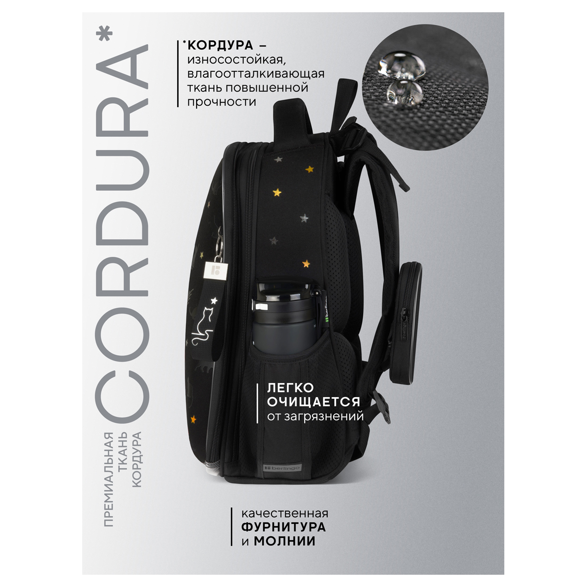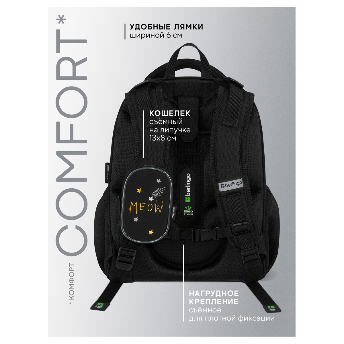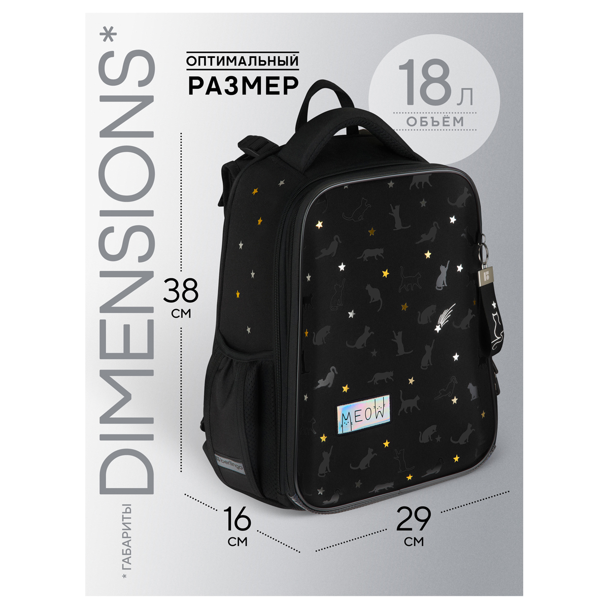 Описание: Эргономичный ранец Berlingo серии Expert размером 37*28*16 см подходит для детей младшего и среднего школьного возраста. Модель выполнена из экологичного ЭВА-материала с покрытием из высокопрочной нейлоновой ткани кордура, которая обладает водоотталкивающими свойствами и легко чистится. Ранец имеет 2 отделения, 2 боковых кармана на резинке, съемный кошелек на лямке для быстрого доступа к необходимым вещам. Внутри предусмотрены разделители для учебных пособий, органайзер для письменных принадлежностей, карман для мобильного телефона, съемный карабин для ключей и именная карточка для подписи. Благодаря анатомической вентилируемой спинке, регулируемым по длине и высоте лямкам, а также нагрудному креплению ранец плотно фиксируется на спине ребенка, что помогает равномерно распределить нагрузку и сохранить правильную осанку. Уплотненная мягкая ручка и петля для подвешивания к парте делают ранец очень удобным. Дно выполнено из водонепроницаемого материала с пластиковыми ножками для защиты от влаги. Световозвращающие элементы на лямках, передней и боковых частях ранца обеспечивают безопасность ребенка в темное время суток. Вес ранца менее 1 кг.
