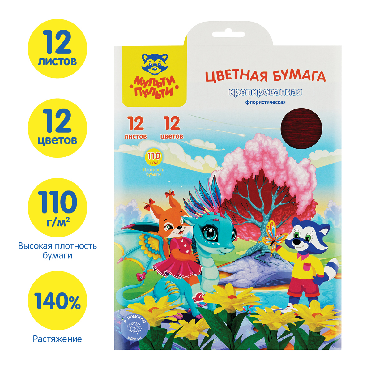 Бумага с крепированной поверхностью «Мульти-Пульти» серии «Енот в сказке» – это замечательный материал для творчества не только детей, но и взрослых. Товар представлен в наборе из 12 листов формата А4 разных цветов в папке с замком для удобного хранения и европодвесом. Бумага плотностью 110 г/кв. м имеет размер 20*28,5 см и растяжение до 140%. Более плотная фактура бумаги и большая способность к растяжению позволяет создавать объемные яркие поделки: цветы, платья для кукол и вызывает у детей большой интерес к творческому процессу. Разрезая, сгибая, склеивая изделие, ребенок производит действия, положительно влияющие на моторику рук. Работа с этим материалом помогает развить и творческие качества малыша: чувство цвета, формы, композиции. • Размер: А4 (20*28,5 см); • Плотность блока: 110 г/кв. м.; • Растяжение: 140%; • Цвет: ассорти.
