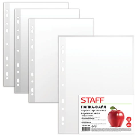 Папки-файлы перфорированные, А3, комплект 50 шт., вертикальные, гладкие, 0,40 мм, 225769