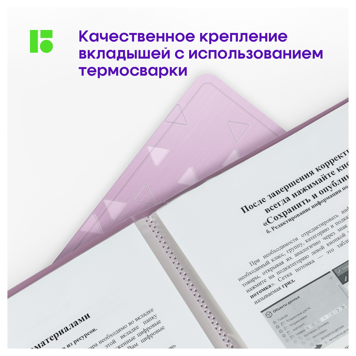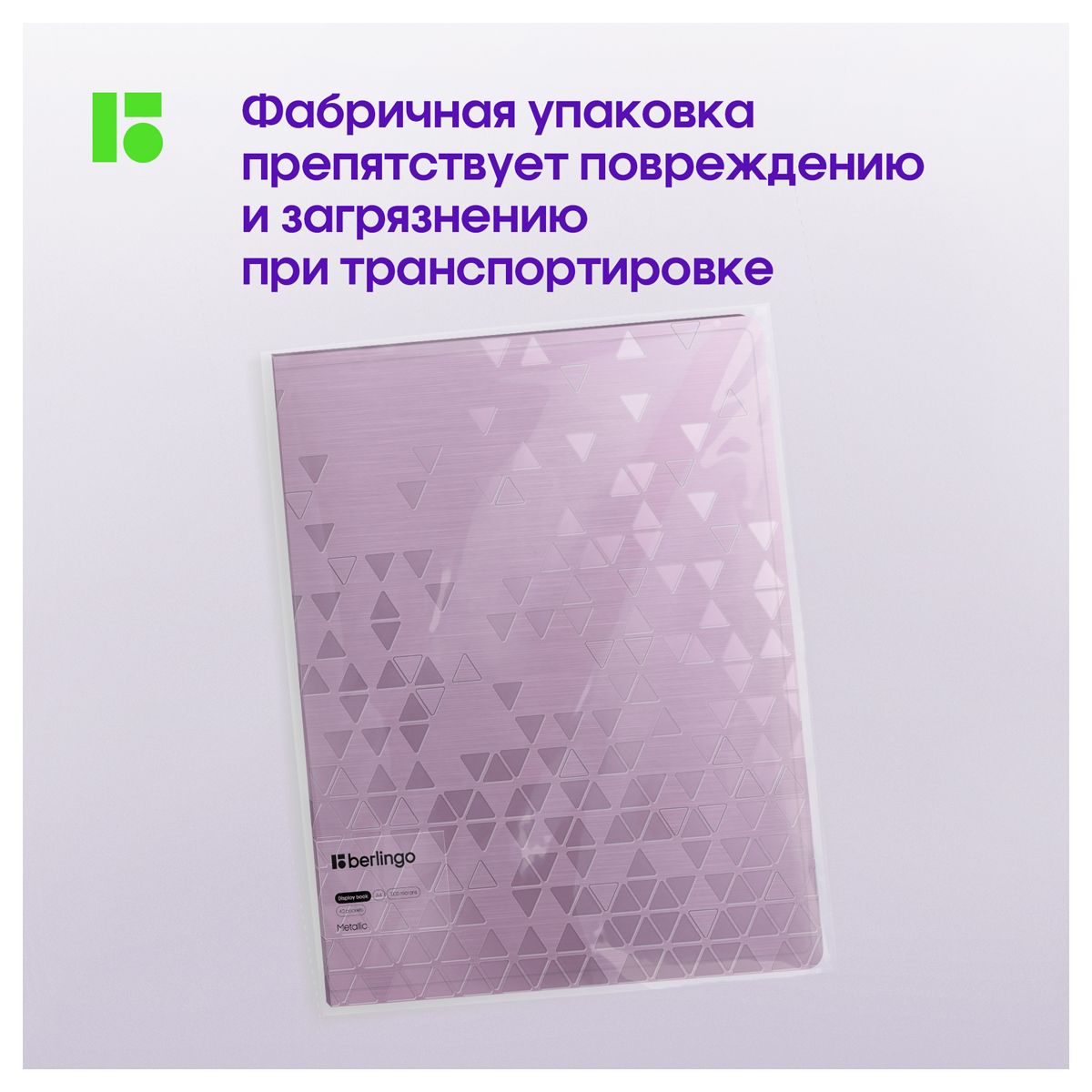 Описание: Папка Berlingo Metallic с 40 вкладышами формата А4 станет ярким помощником для хранения документов. Размер изделия – 310*235*24 мм, ширина корешка – 24 мм, толщина материала – 1000 мкм. Папка вмещает до 100 бумажных листов. Листы-карманы увеличенной толщины 30 мкм надежно скреплены сваркой. Папка изготовлена из высококачественного полипропилена с матовой текстурой поверхности «рельефные треугольники», на которой не видно отпечатков пальцев и мелких царапин. Сиреневый металлический оттенок папки будет изысканно смотреться на любом рабочем месте. Внутренняя сторона оснащена плотным прозрачным карманом для удобного хранения мелочей: ручки, заметок, визиток, дисков, флешек и другого. Упакована в индивидуальный прозрачный пакет • Формат: А4; • Количество вкладышей: 40; • Ширина корешка: 24 мм; • Толщина материала: 1000 мкм; • Тип скрепления: термосварка; • Размер: 310*235*24 мм; • Цвет: сиреневый металлик