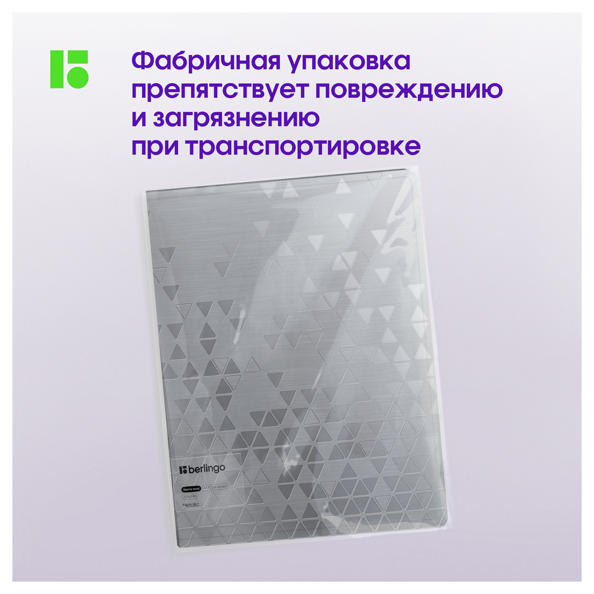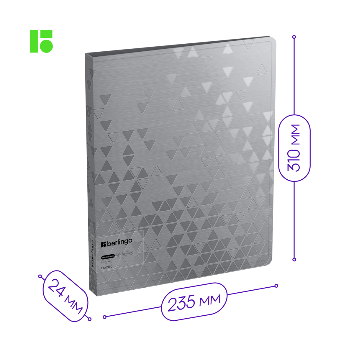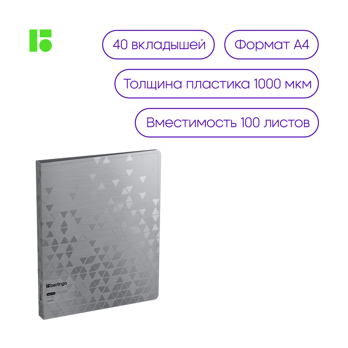 Описание: Папка Berlingo Metallic с 40 вкладышами формата А4 станет ярким помощником для хранения документов. Размер изделия – 310*235*24 мм, ширина корешка – 24 мм, толщина материала – 1000 мкм. Папка вмещает до 100 бумажных листов. Листы-карманы увеличенной толщины 30 мкм надежно скреплены сваркой. Папка изготовлена из высококачественного полипропилена с матовой текстурой поверхности «рельефные треугольники», на которой не видно отпечатков пальцев и мелких царапин. Серебряный металлический оттенок папки будет изысканно смотреться на любом рабочем месте. Внутренняя сторона оснащена плотным прозрачным карманом для удобного хранения мелочей: ручки, заметок, визиток, дисков, флешек и другого. Упакована в индивидуальный прозрачный пакет • Формат: А4; • Количество вкладышей: 40; • Ширина корешка: 24 мм; • Толщина материала: 1000 мкм; • Тип скрепления: термосварка; • Размер: 310*235*24 мм; • Цвет: серебряный металлик
