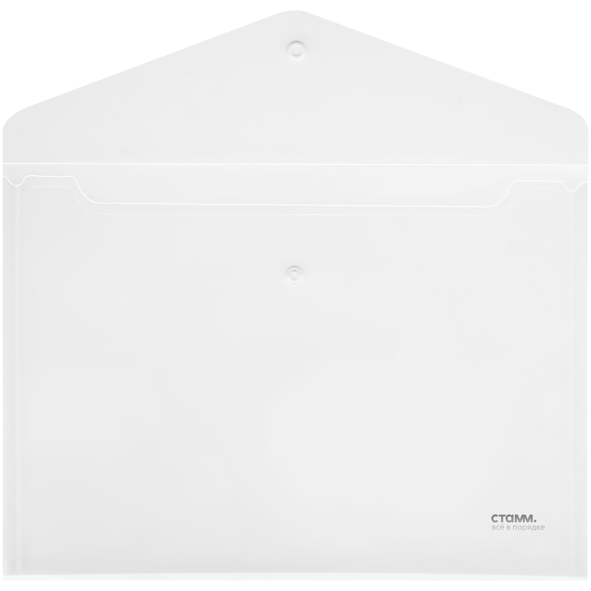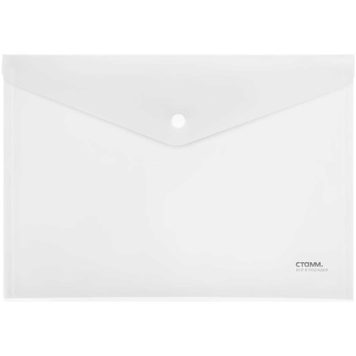 Описание: Папка-конверт на кнопке «СТАММ» формата А4 надёжно защищает документы от влаги и пыли. Горизонтальное изделие вмещает до 100 листов. Цвет папки – прозрачный бесцветный. Она изготовлена из качественного полипропилена плотностью 180 мкм с глянцевой текстурой. Размер папки составляет 330*235 мм. Изделие плотно закрывается на кнопку. • Размер: 330*235 мм; • Толщина материала: 180 мкм; • Формат: А4; • Вместимость в листах: до 100 листов; • Цвет: прозрачный бесцветный; • Способ фиксации: кнопка.