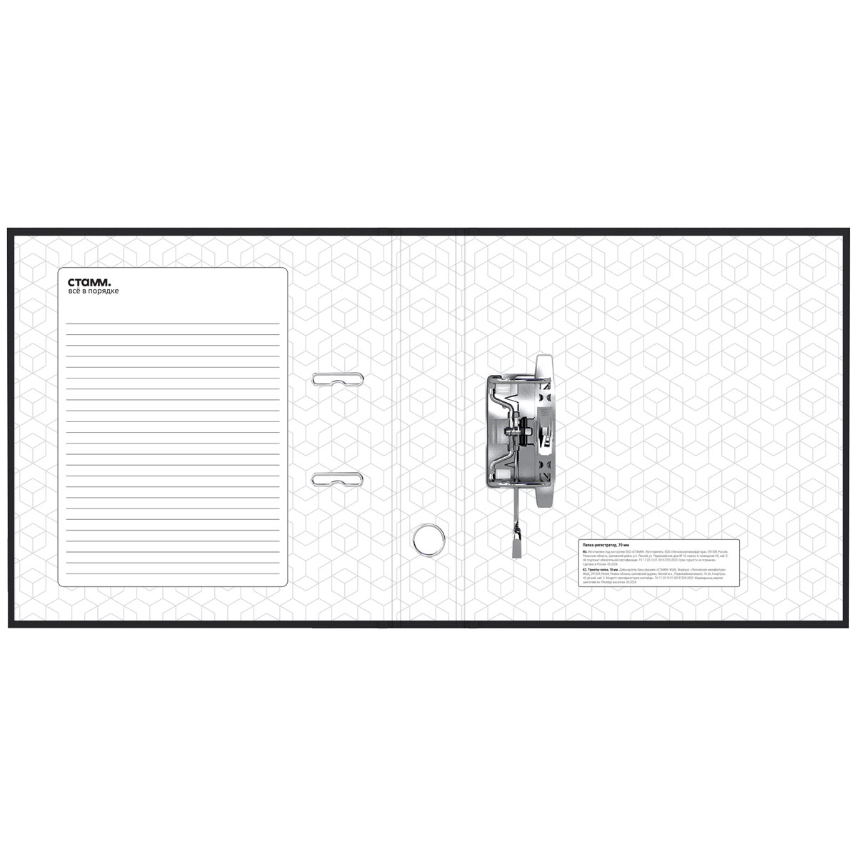 Папка-регистратор «СТАММ» серии «Стандарт» формата А4 с арочным механизмом идеальна для создания архива и экономии офисного пространства. Папка вмещает до 550 листов. Размер папки – 320*290*70 мм. Ориентация папки – вертикальная. Ширина корешка составляет 70 мм. Минималистичный классический дизайн: папка выполнена в насыщенном чёрном цвете. Изготовлена из жесткого износостойкого картона с односторонним покрытием из бумвинила. Папка имеет арочный механизм из качественного металла. Конструкция разработана с учетом всех особенностей эксплуатации. Эргономичное отверстие в корешке помогает быстро снять папку с полки. На корешке папки есть карман со сменным информационным ярлыком для маркировки. На внутренней стороне обложки папка-регистратор имеет поле для записи. • Вместимость, в листах: 550; • Формат: А4; • Цвет: чёрный; • Ширина корешка: 70 мм