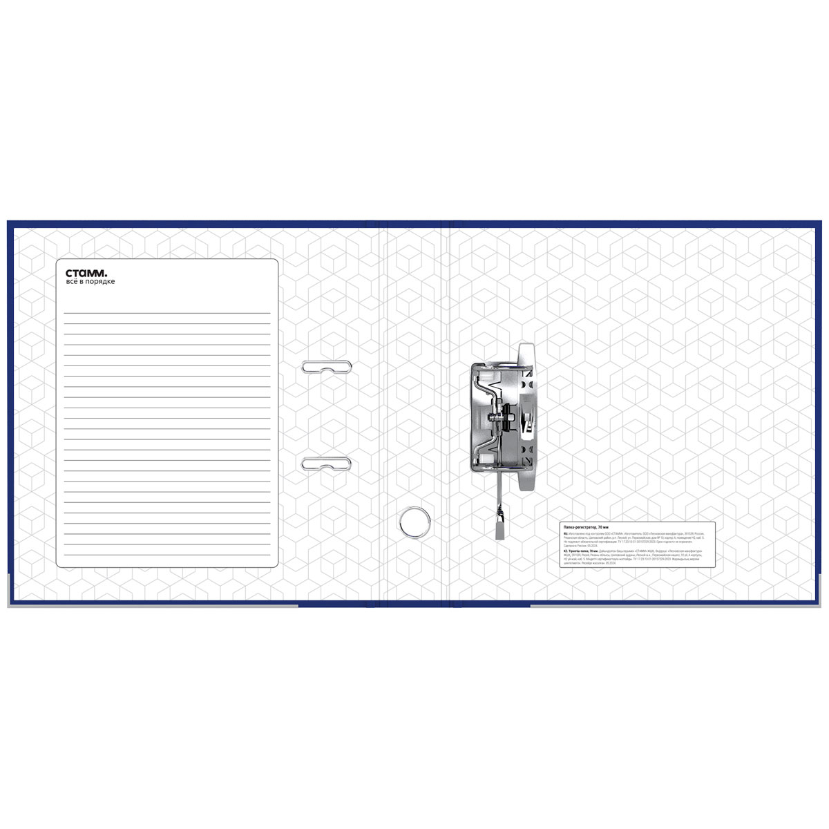 Папка-регистратор «СТАММ» серии «Бизнес» формата А4 с арочным механизмом эффективно экономит офисное пространство и идеальна для создания архива. Папка вмещает до 550 листов. Размер папки – 320*290*70 мм. Ориентация – вертикальная. Ширина корешка составляет 70 мм. Минималистичный классический дизайн: папка выполнена в глубоком синем цвете. Изготовлена из жесткого износостойкого картона с односторонним покрытием из бумвинила. Нижние грани укреплены металлическим кантом. Внутреннее покрытие – бумага. Папка имеет арочный механизм из качественного металла. Конструкция разработана с учетом всех особенностей эксплуатации. Эргономичное отверстие в корешке помогает быстро снять папку с полки. На корешке папки есть карман со сменным информационным ярлыком для маркировки. На внутренней стороне обложки папка-регистратор имеет поле для записи. • Вместимость, в листах: 550; • Формат: А4; • Цвет: синий; • Ширина корешка: 70 мм