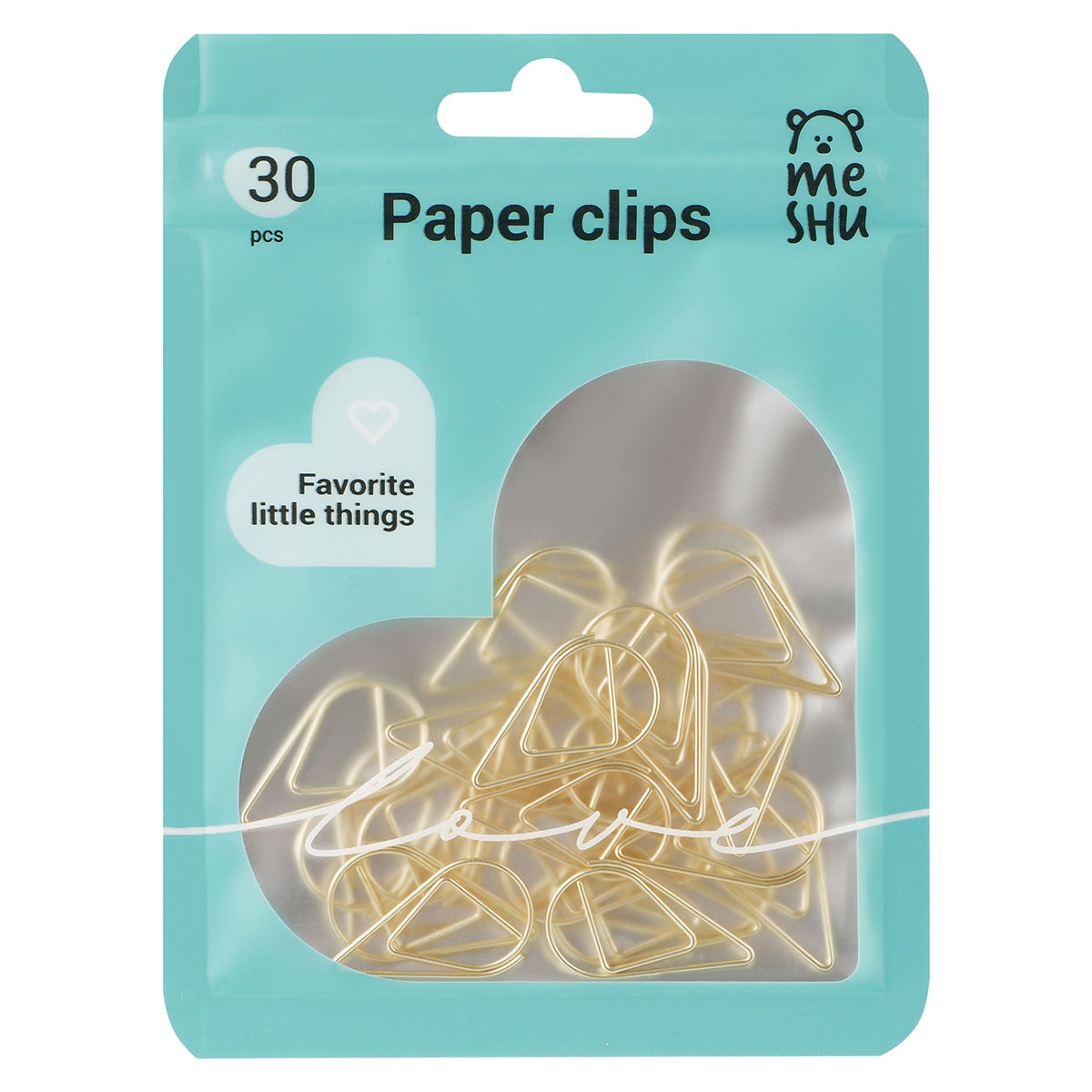 Фигурные скрепки MESHU "Little Drops" золотого цвета предназначены для скрепления листов и закрепления заметок. Размер одной скрепки — 25 мм. Их также можно использовать как закладки для книг, для украшения ежедневника и оформления подарков. Изделия поставляются в пакете с зип-лок застежкой и европодвесом. Набор состоит из 30 штук.