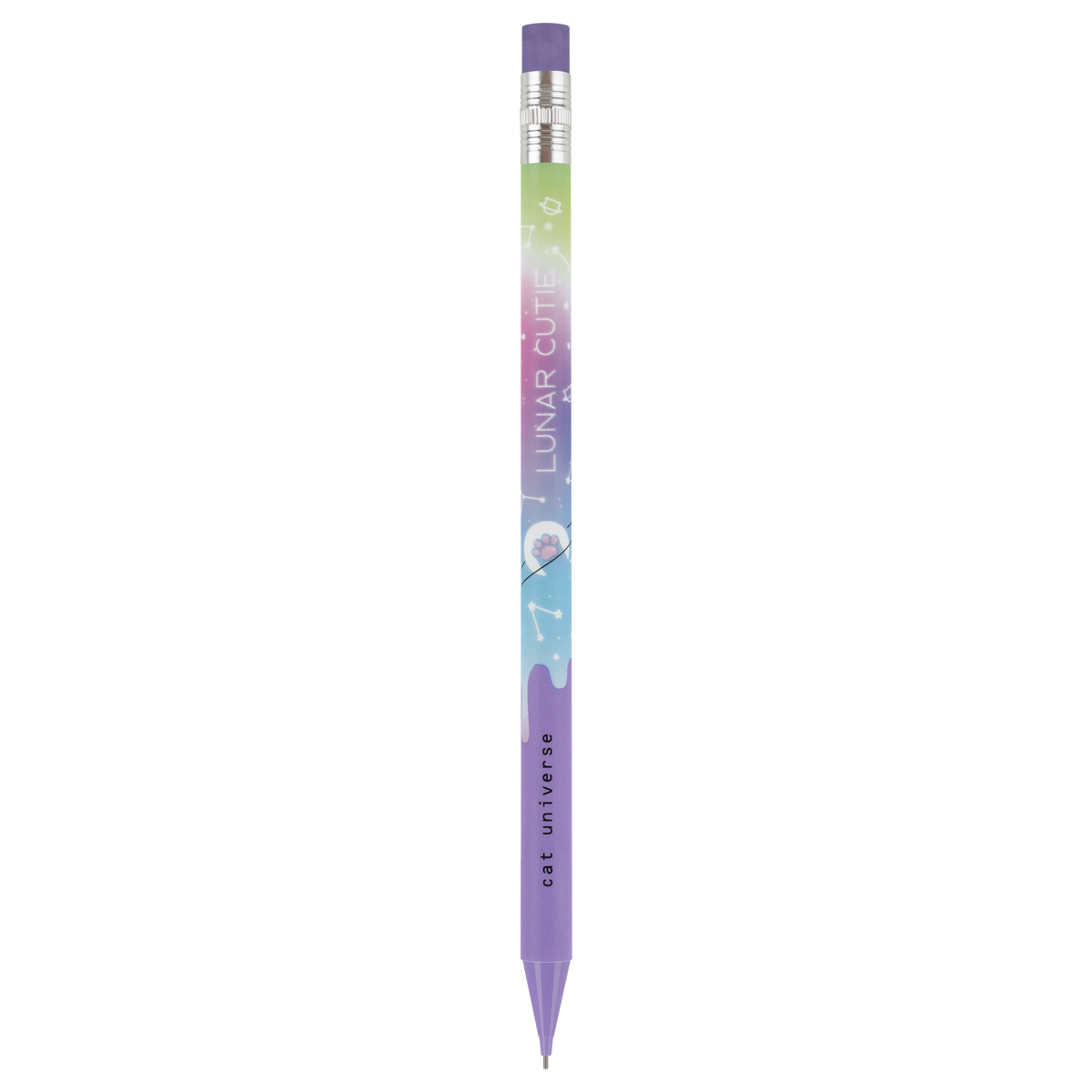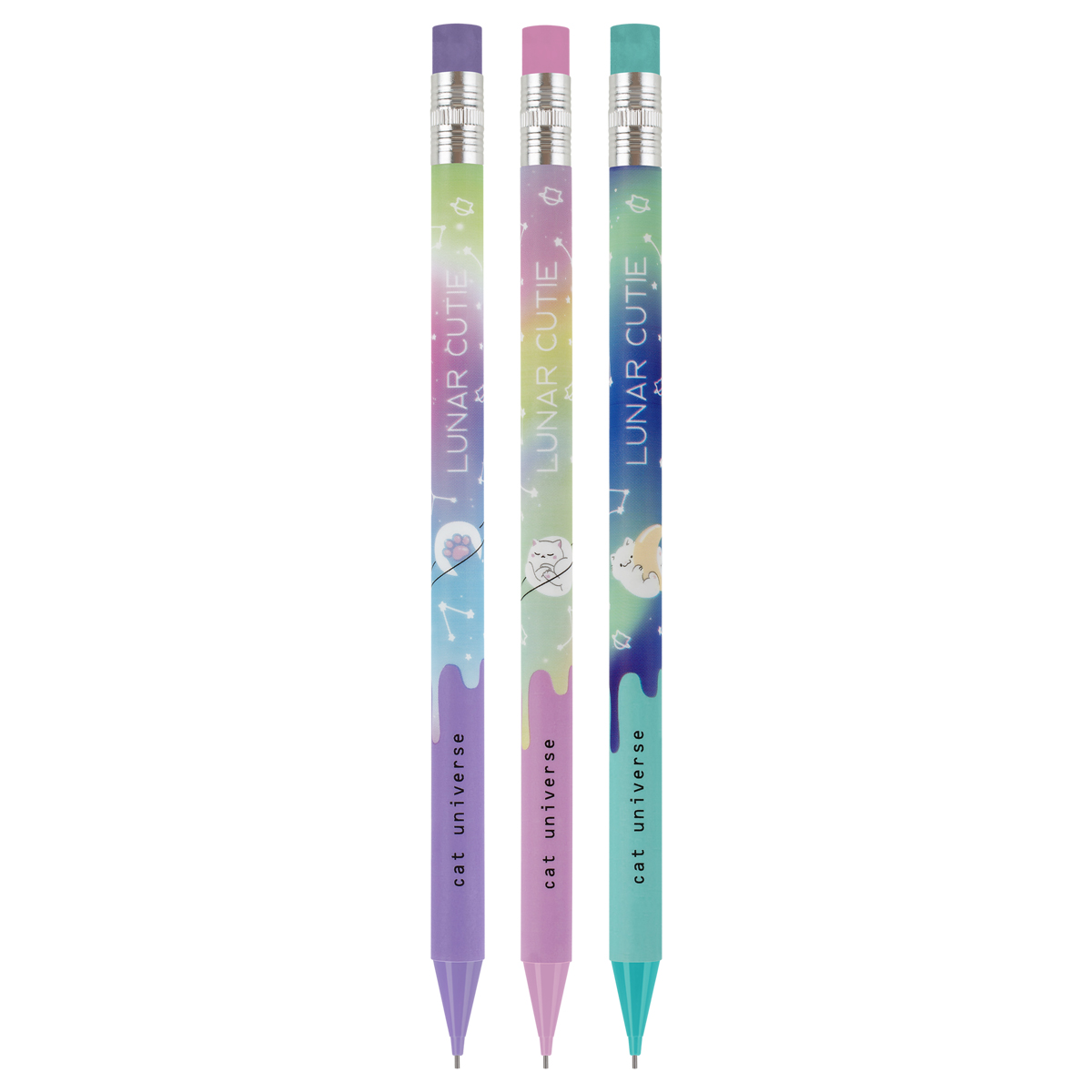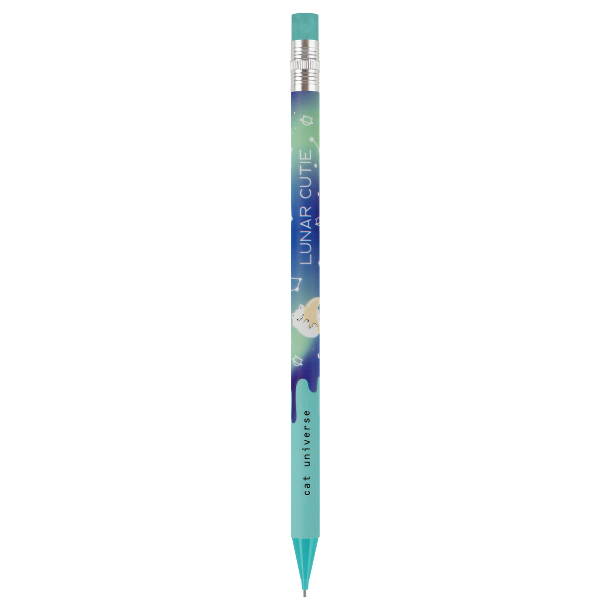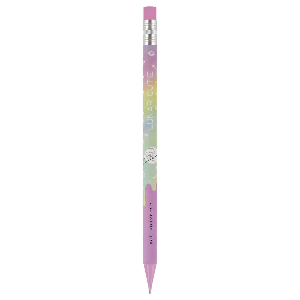 Механические карандаши с печатью на корпусе и ластиком MESHU Cat Universe станут отличными помощниками в школе или офисе. Круглый корпус выполнен в стильных, ярких дизайнах, рисунки нанесены высококачественной термотрансферной печатью. Диаметр грифеля – 0,7 мм, твердость – HB, материал корпуса – пластик. Карандаши упакованы в картонный дисплей-бокс по 18 штук. Подача грифеля осуществляется с помощью кнопочного механизма. Стильные яркие дизайны понравятся всем любителям милой и забавной канцелярии. • Твердость: HB; • Форма корпуса: круглая; • Наличие ластика: да; • Цвет корпуса: ассорти; • Количество штук в упаковке: 18; • Тип упаковки: картонный дисплей-бокс.