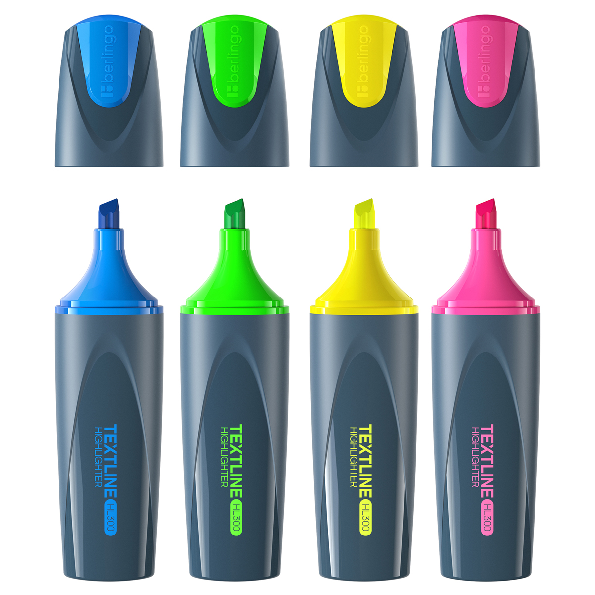 Набор текстовыделителей, 4 цвета: жёлтый, зелёный, голубой, розовый. Флуоресцентные чернила на водной основе. Выполнены в оригинальном корпусе графитового цвета с сочетанием матовых и глянцевых поверхностей. Яркие элементы колпачка и нанесение соответствуют цвету чернил. Длина непрерывной линии письма - 300 метров. Скошенный наконечник с толщиной линии от 1 до 5 мм. Упаковка - PET-бокс с европодвесом.