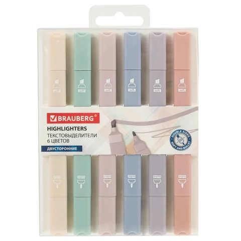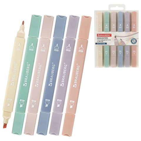 Двусторонние текстовыделители BRAUBERG "Morandi" предназначены для выделения текста на бумаге любого типа. Идеально подходят для скетчинга, а также решения учебных, домашних и офисных задач.В наборе 6 двусторонних текстовыделителей цветов моранди – миндальный, кирпично-розовый, темный серовато-синий, льняной, пыльно-зеленый, кремовый. Нежные и приглушенные цвета Моранди позволяют создать мягкие переходы и равномерно подчеркнуть необходимую информацию в тексте. Цвет корпуса соответствует цвету чернил.Текстовыделители имеют корпус прямоугольной формы диаметром 12 мм. Одна сторона имеет мягкий скошенный наконечник с линией письма от 1 до 5 мм, что обеспечивает ровное, непрерывное нанесение при работе с текстом, напечатанным мелким шрифтом, или таблицами. Вторая сторона имеет пулевидный наконечник, с помощью которого можно рисовать или закрашивать различные рисунки или надписи.Благодаря особой водной основе чернил текстовыделители не высыхают без колпачка в течение 8 часов. Текстовыделители обладают экономным расходом чернил, не портят бумагу, не смазывают текст и не просвечиваются.Выделяйте важное, структурируйте информацию, читайте с комфортом – в этом вам поможет набор текстовыделителей BRAUBERG "Morandi"!